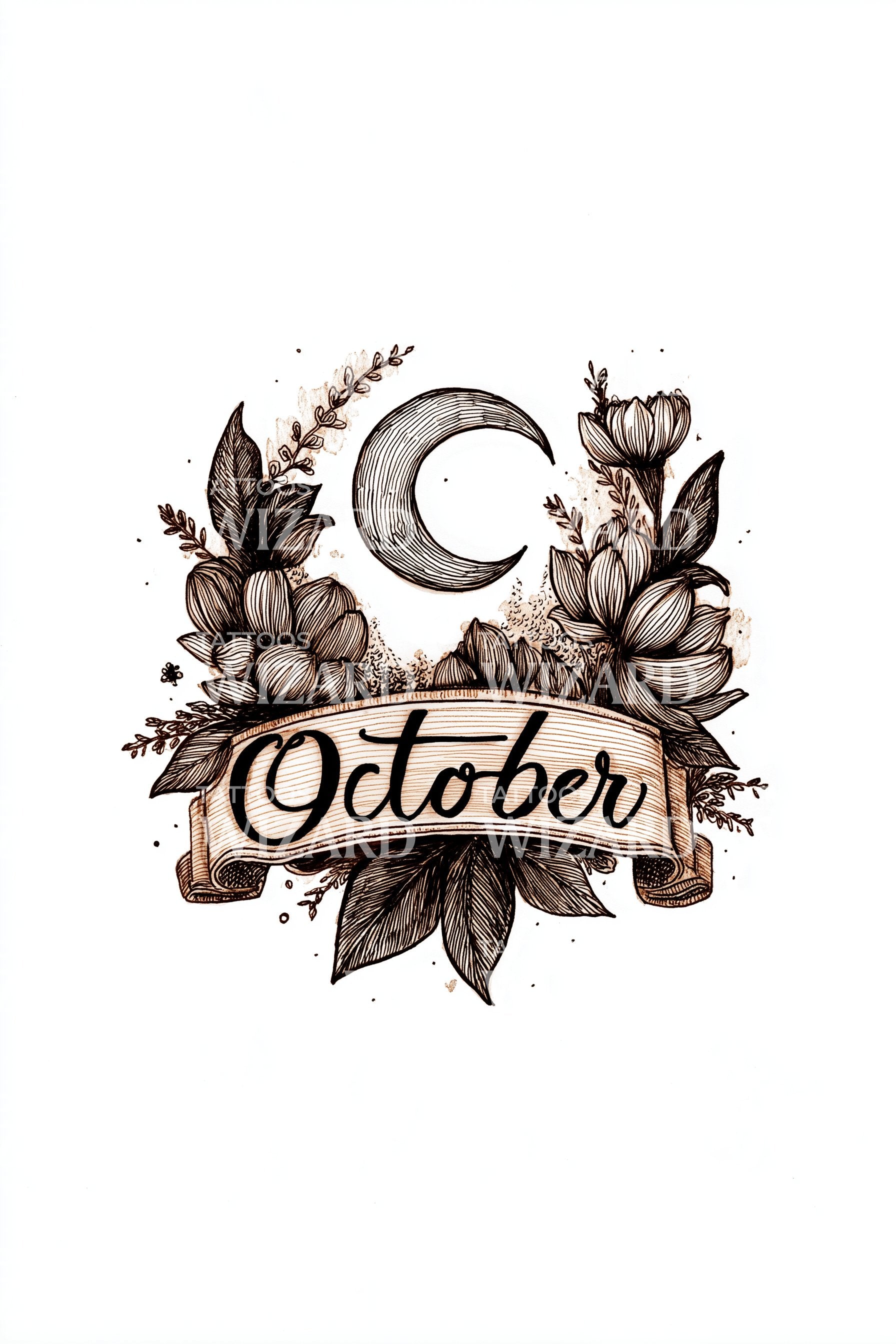 Sepia neotraditional linework frames a crescent moon above a vintage scroll scripted October, cradled by autumn leaves and blossoms. The moon honors cycles and intuition, while foliage celebrates change and harvest. Wearing it feels like twilight warmth and woodsmoke memory, a personal rite of renewal and quiet magic.