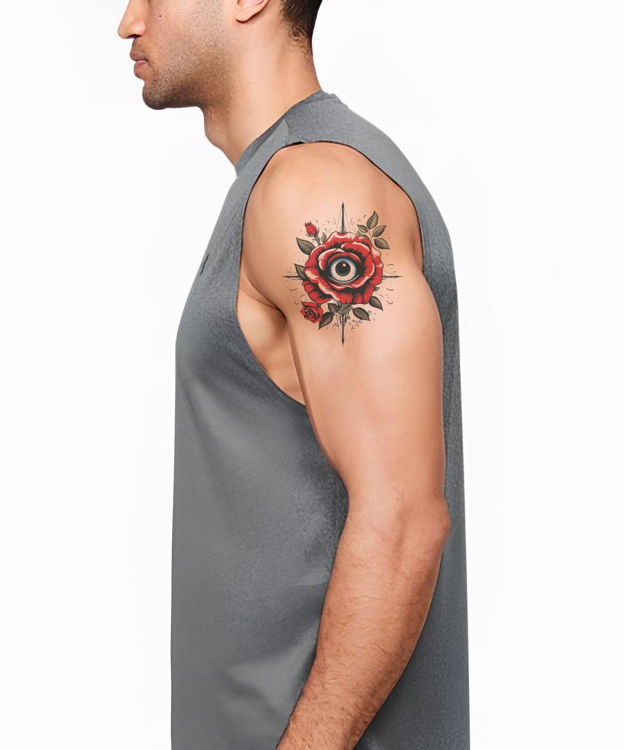 这个老派纹身设计展示了神秘之眼、盛开的红玫瑰和可靠的指南针的迷人结合。它散发着复古魅力,被郁郁葱葱的绿叶环绕。对于喜欢古老美学与隐藏意义结合的人来说,这是一个绝佳的纹身选择。
