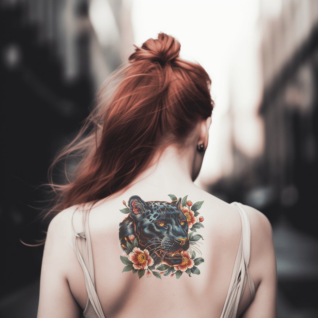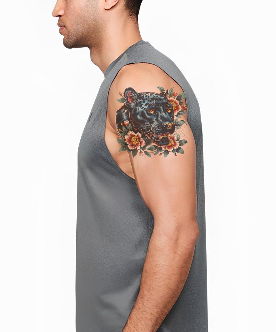 释放你强烈的精神,选择我们的复古黑豹纹身设计。这件独特的作品融合了亚洲花卉美学,与神秘的猫科捕食者形成美丽的对比。以大胆的黑色呈现,动物性与宁静完美结合。非常适合展示你不羁的一面。