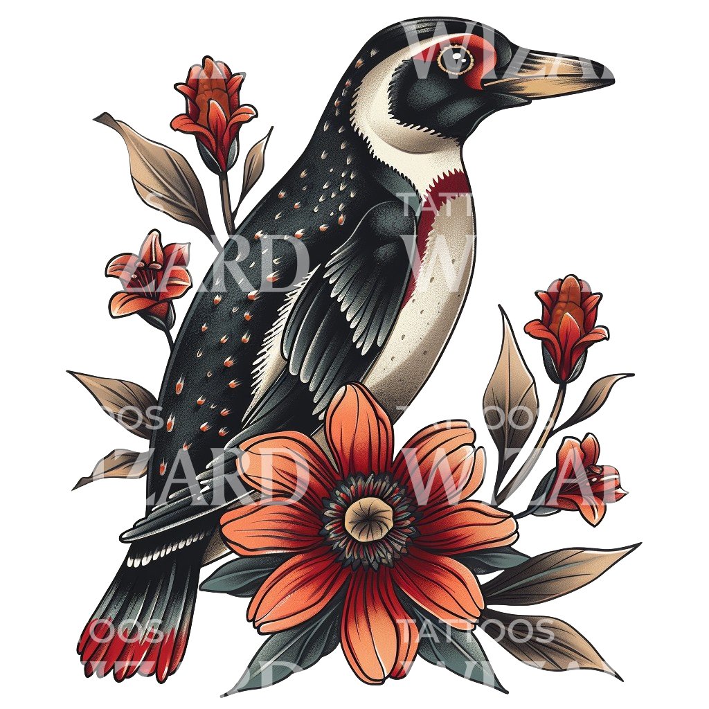 揭开老派艺术的魔力,欣赏玛丽的复古企鹅图案纹身设计。精致细腻的鸟儿盛开着,伴随着娇嫩的红花,拥抱自然的奇幻之美。用动物美学来表达你的风格宣言!非常适合死忠的纹身爱好者。