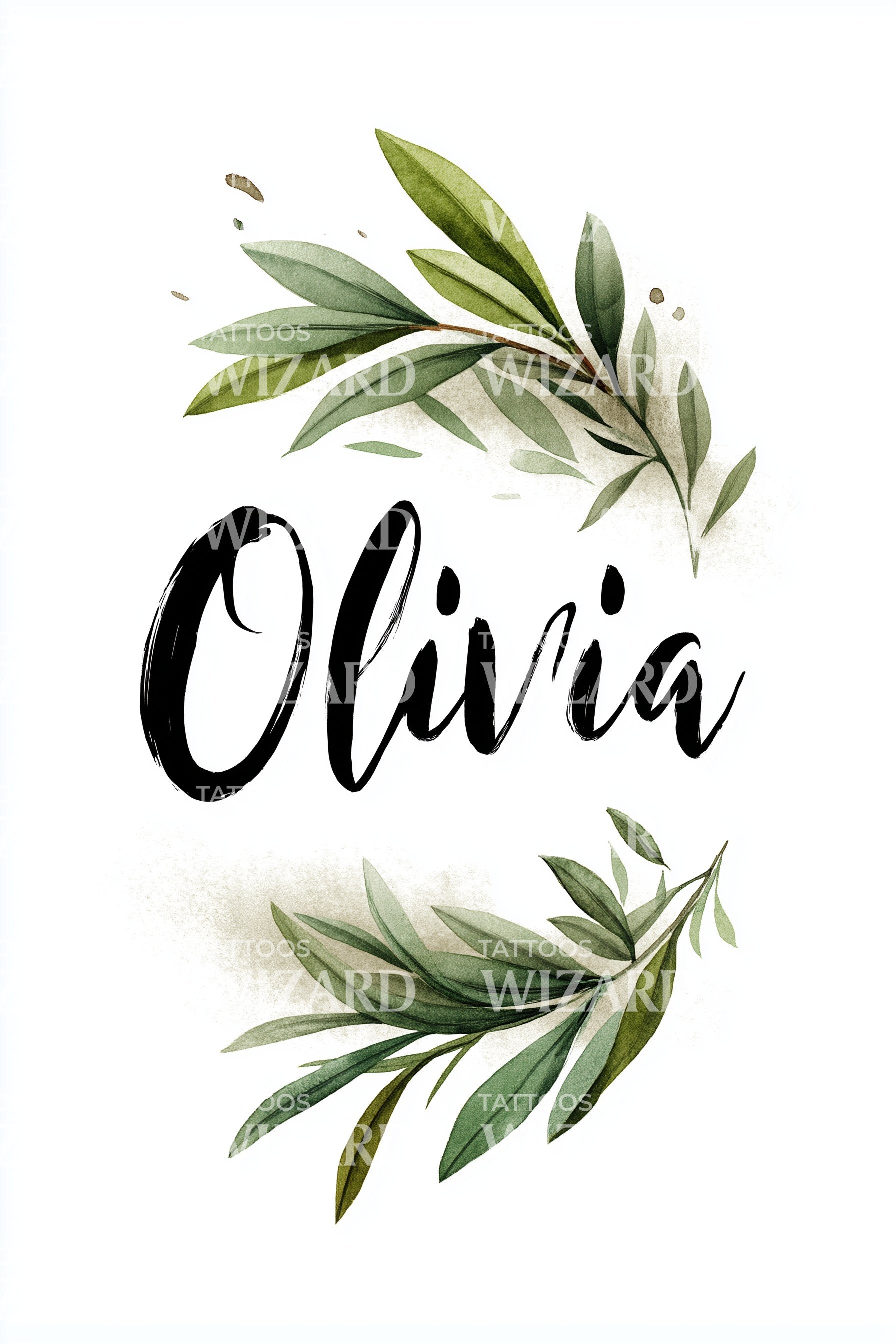 Olivia blooms in fluid watercolor script, embraced by airy olive leaves washed in tender greens. The olive branch signifies peace, resilience, and rooted grace, a quiet vow to grow and forgive. Wearing this design feels like sunlight through trees, breathing nature’s calm, personal, evergreen renewal.