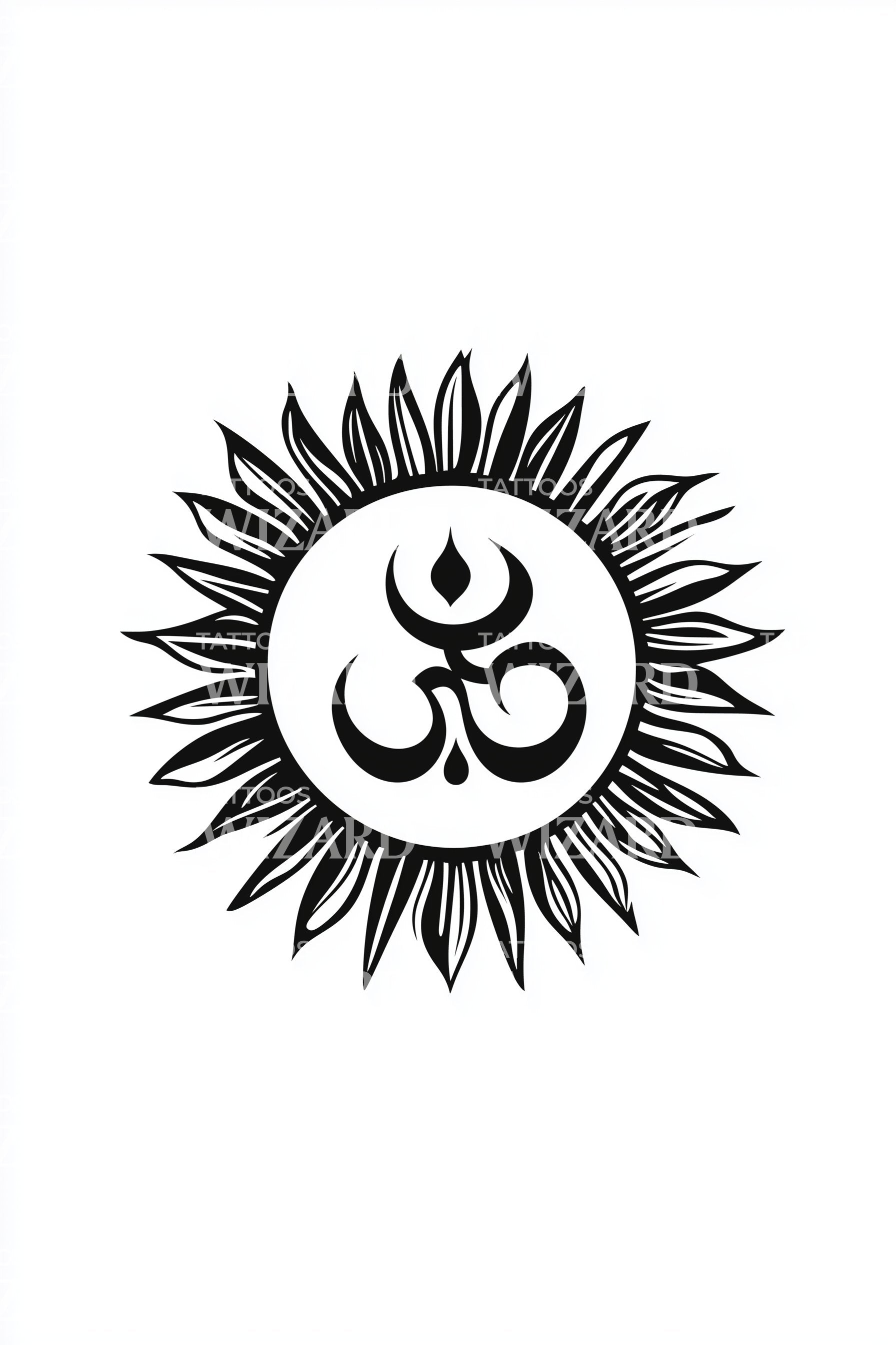 Radiant geometry frames a centered circle, its crisp sun rays sculpted like slender petals. At the heart, a minimal Om flows in dark ink, echoing breath and origin. Symbol of awakening, warmth, and unity, this piece feels grounding, quietly luminous, and personally devotional, for everyday clarity and courage.