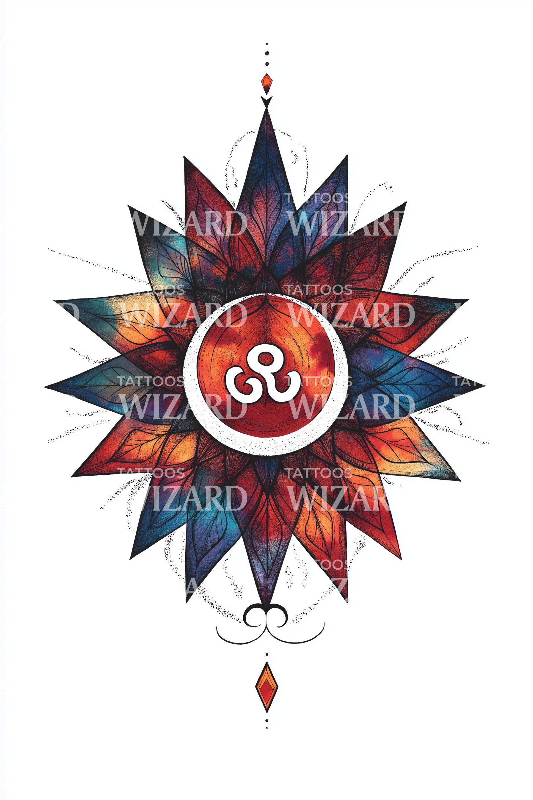 沉浸于这款充满活力的Om曼陀罗纹身设计的精神光辉中。它是迷人曼陀罗图案与神圣几何的精妙融合,色彩斑斓,层层叠叠。这款充满动感的纹身散发出宁静的氛围,将Om符号融入纯粹的艺术之中。