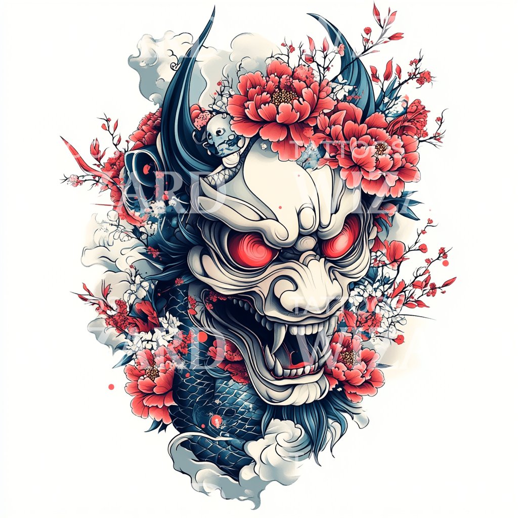 用这个日本传统的鬼纹身设计点燃你的美学。它展示了一个极其复杂的恶魔面具,装饰着华丽的花朵,全部浸泡在大胆的红色阴影中。这件生动的作品象征着保护和转变,是你不屈精神的完美象征。