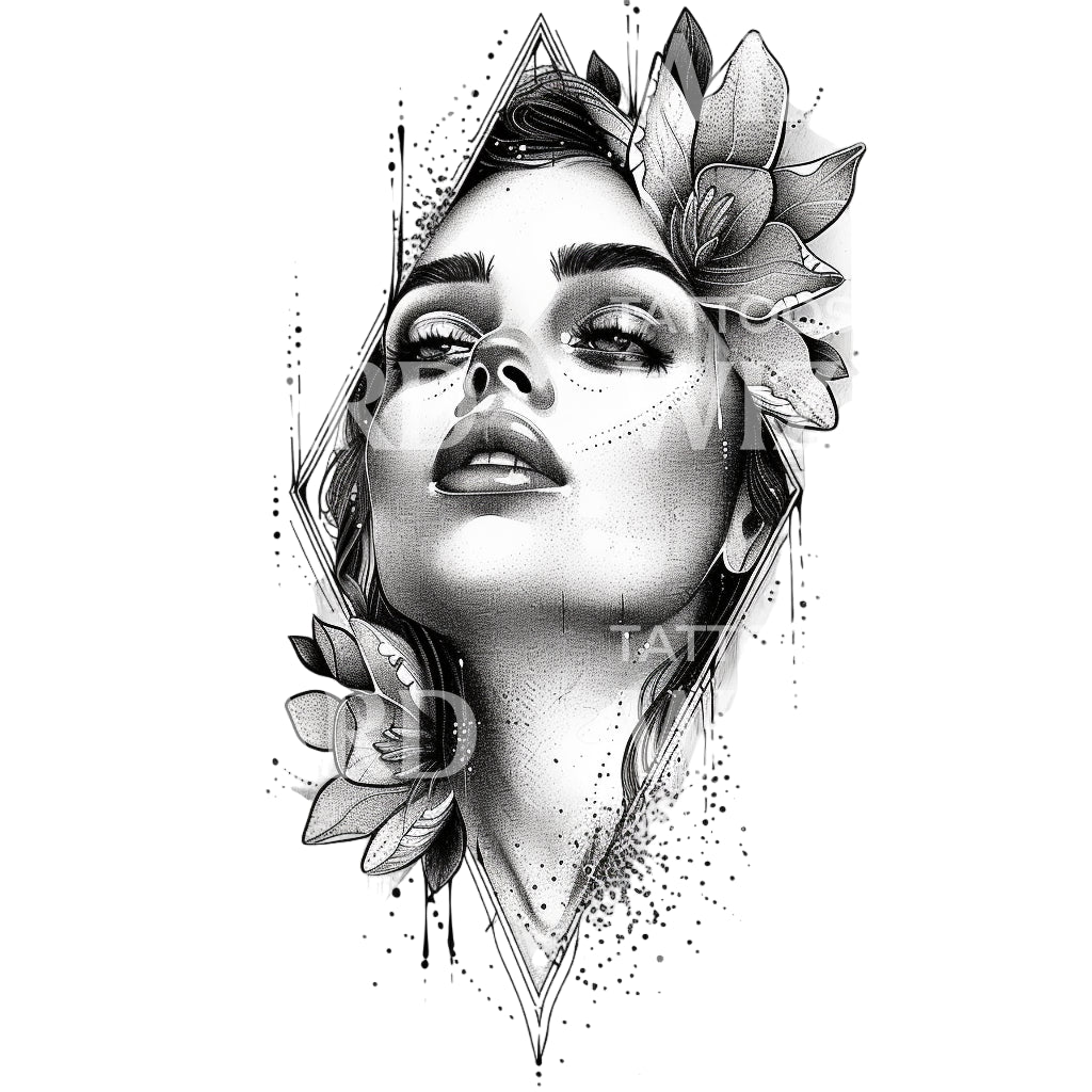 沉浸在奥菲莉亚的诗意神话中,这款复杂的点刺纹身设计。采用黑灰色调精心制作,捕捉了一位女性的肖像,装饰着花朵和引人注目的菱形。来自著名纹身艺术家约翰的富有想象力和艺术性的象征。