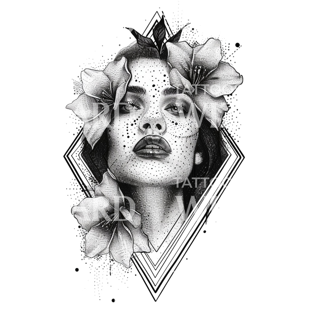 沉浸在奥菲莉亚的美丽中,这款引人注目的纹身设计展现了精致的点刺技法。这幅黑白肖像以迷人的细节捕捉了这位神话女性。配以花卉元素和菱形图案,它是著名纹身艺术家约翰的艺术杰作。