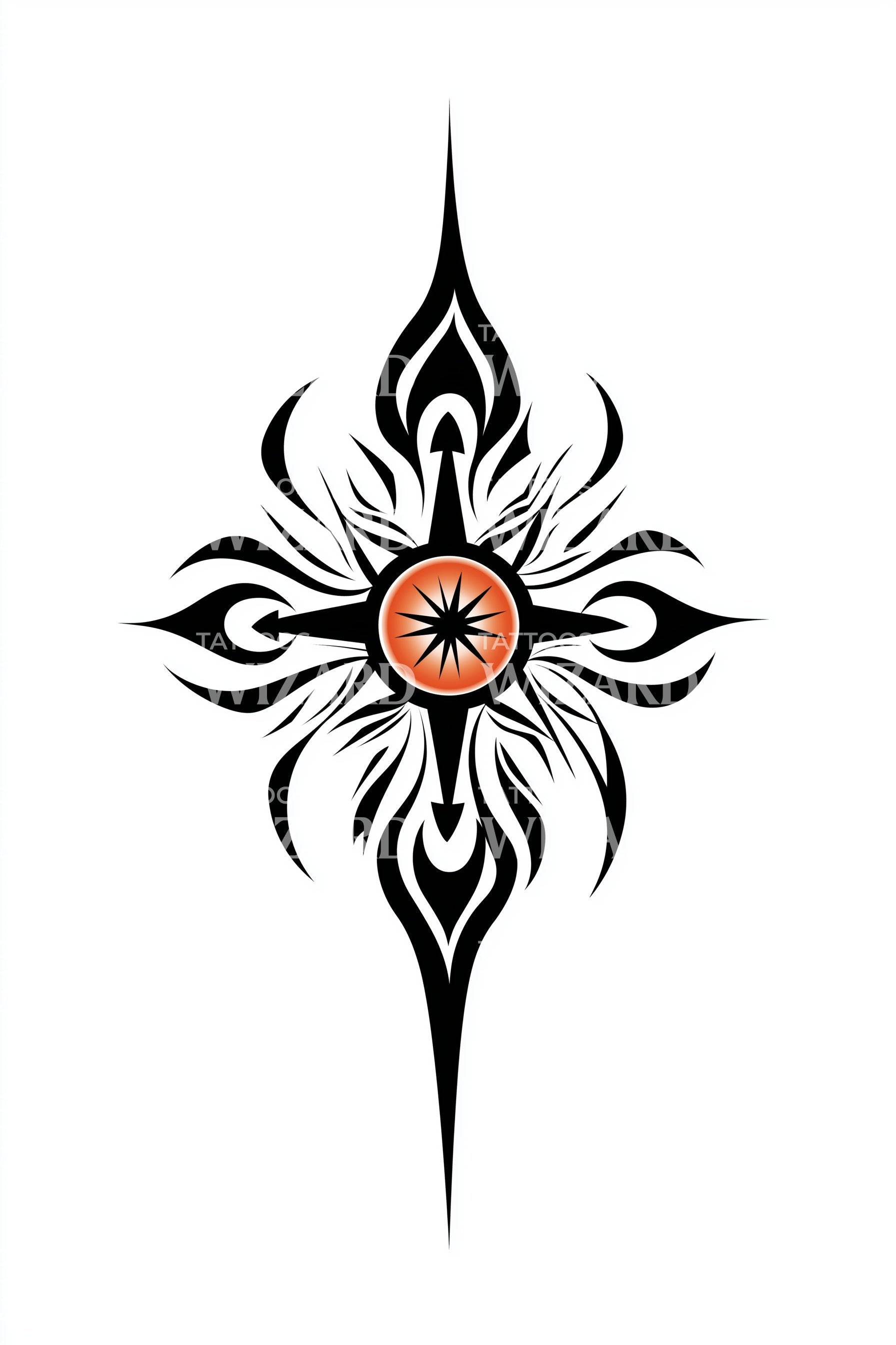 探索未知领域,尽在这款部落纹身设计中。它散发着活力与个性,特色是一枚独特的橙色指南针,交织于部落尖刺之间。其星形元素更添魅力,整体呈现出引人入胜的视觉效果,完美呼应您那充满冒险精神的内心。