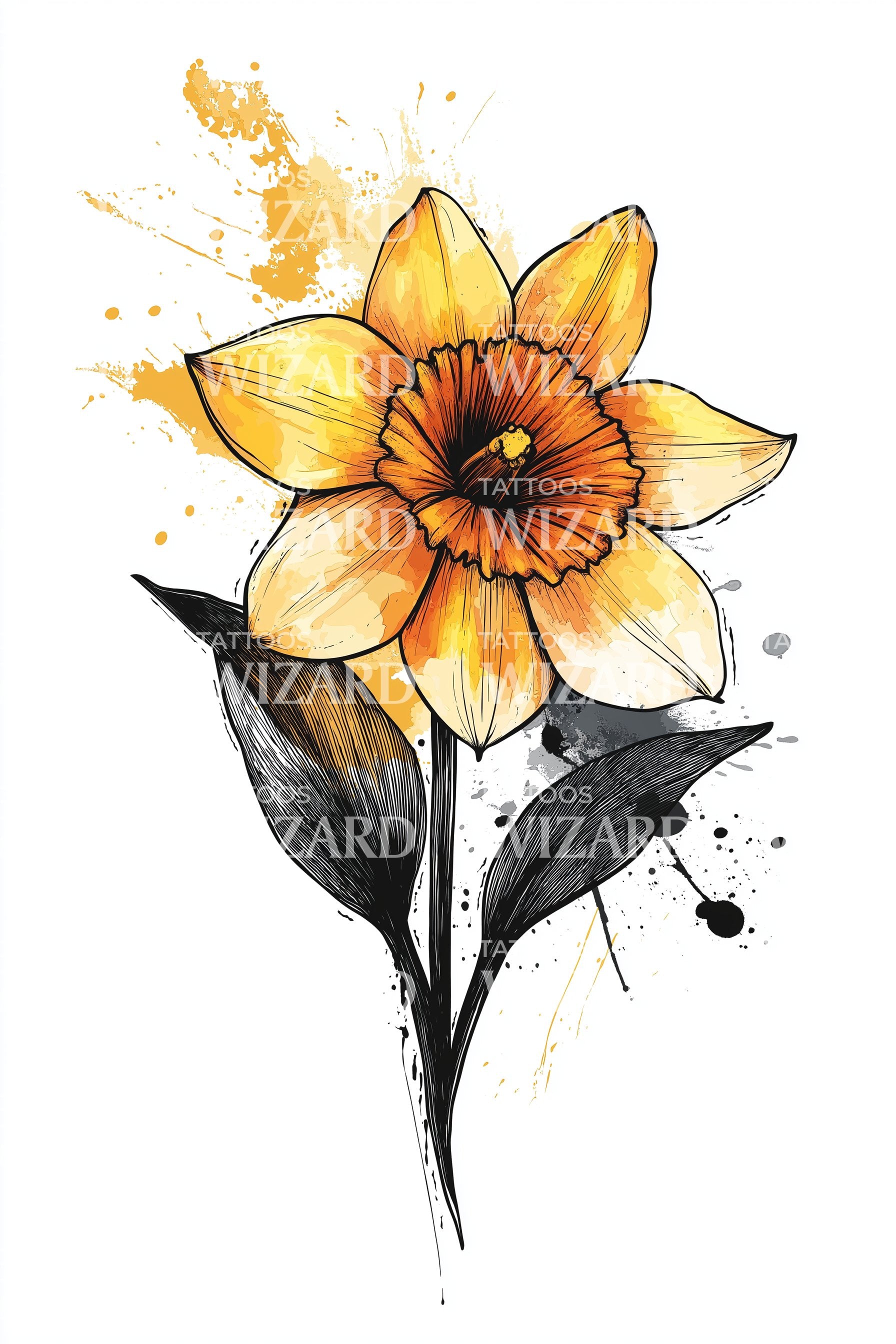 释放你的个性,这款水彩水仙花纹身设计。充满生机的橙色调,这朵醒目的花朵以细腻而富有艺术感的风格捕捉了大自然的精髓。它将你对花卉的热爱转化为美学宣言,彰显水仙花短暂而迷人的美丽。