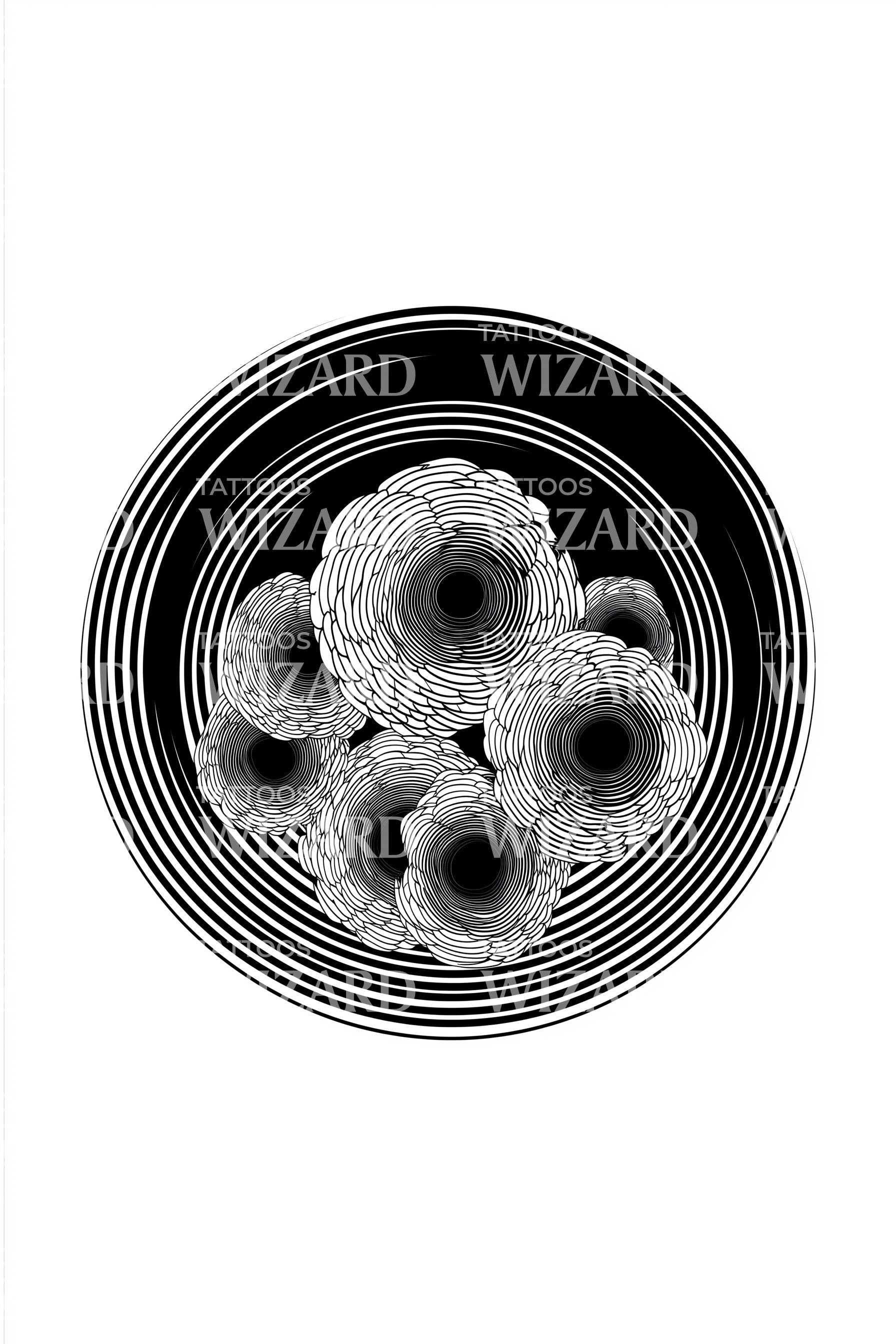 这款黑色纹身设计融合了黑暗与美丽的元素。焦点是一颗雄伟的球体,被盛开的颠茄花环绕,散发出神秘的魅力。被坚固的圆圈包围,这个设计完美地体现了黑暗美学与花卉绽放之间的平衡。