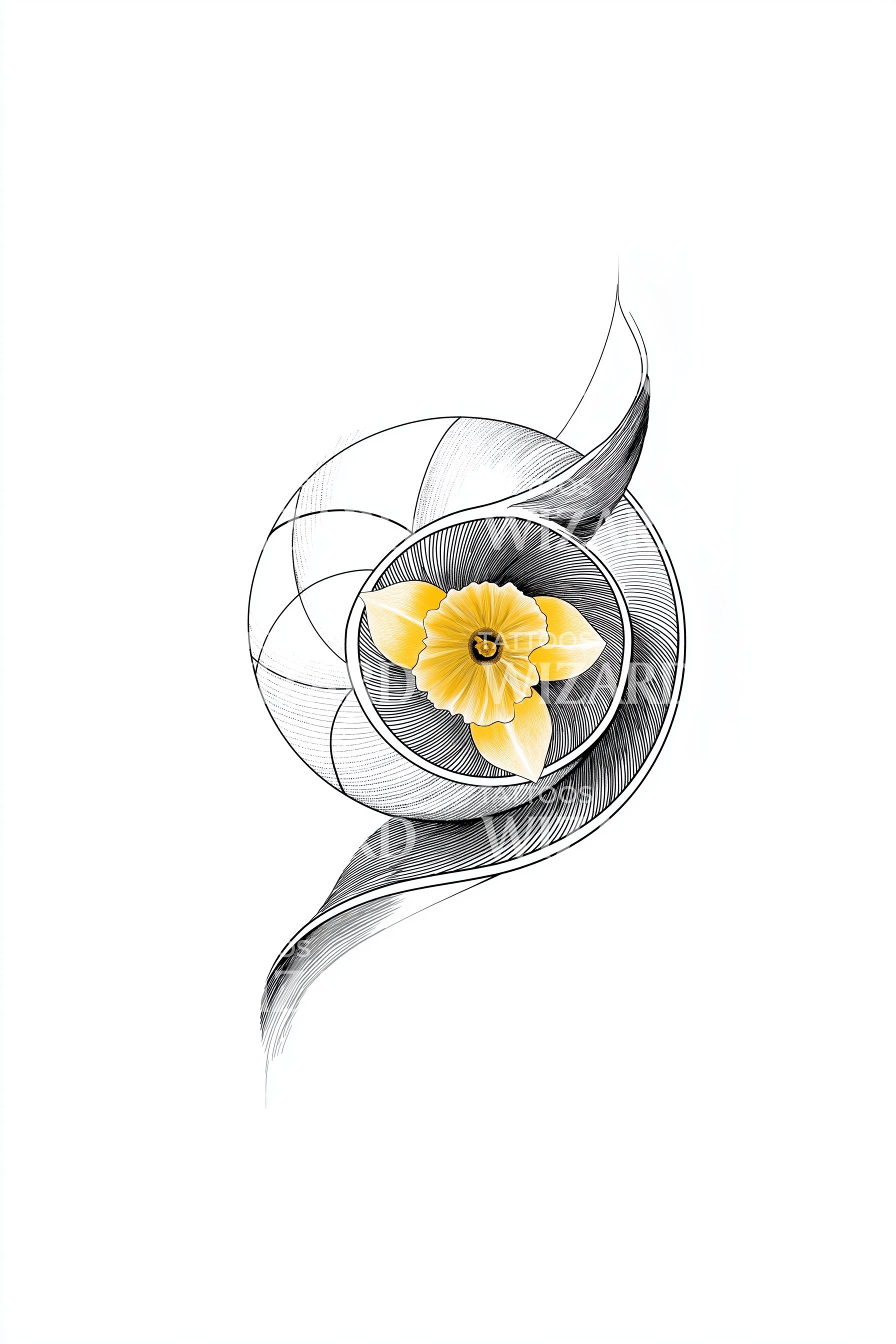 展现您独特的风格,这款令人惊叹的几何纹身设计。设计巧妙地将水仙花与轨道图案交织融合,融合了自然与宇宙的元素,搭配鲜艳的黄色调。非常适合追求视觉冲击力的您,这款纹身将大地与宇宙的美丽完美结合。