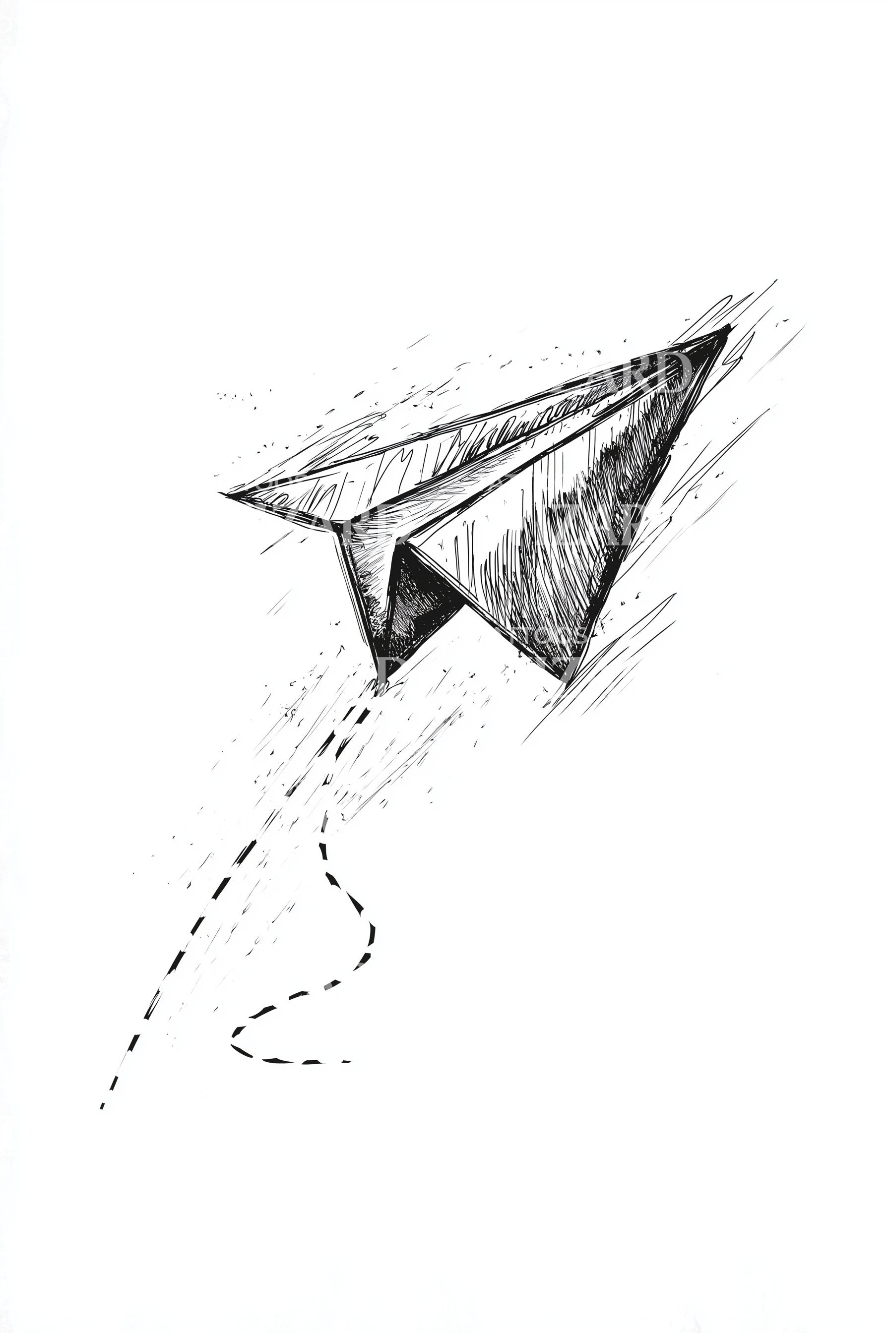 Ink-drawn origami glider cuts forward in black sketch lines, a minimal plane with dashed trail. Symbol of lightness, childhood courage, and choosing your own wind; a reminder to travel simply. Wears like quiet lift, a compass. Forearm for glide, ribs for ascent, ankle for wander, collarbone for line.