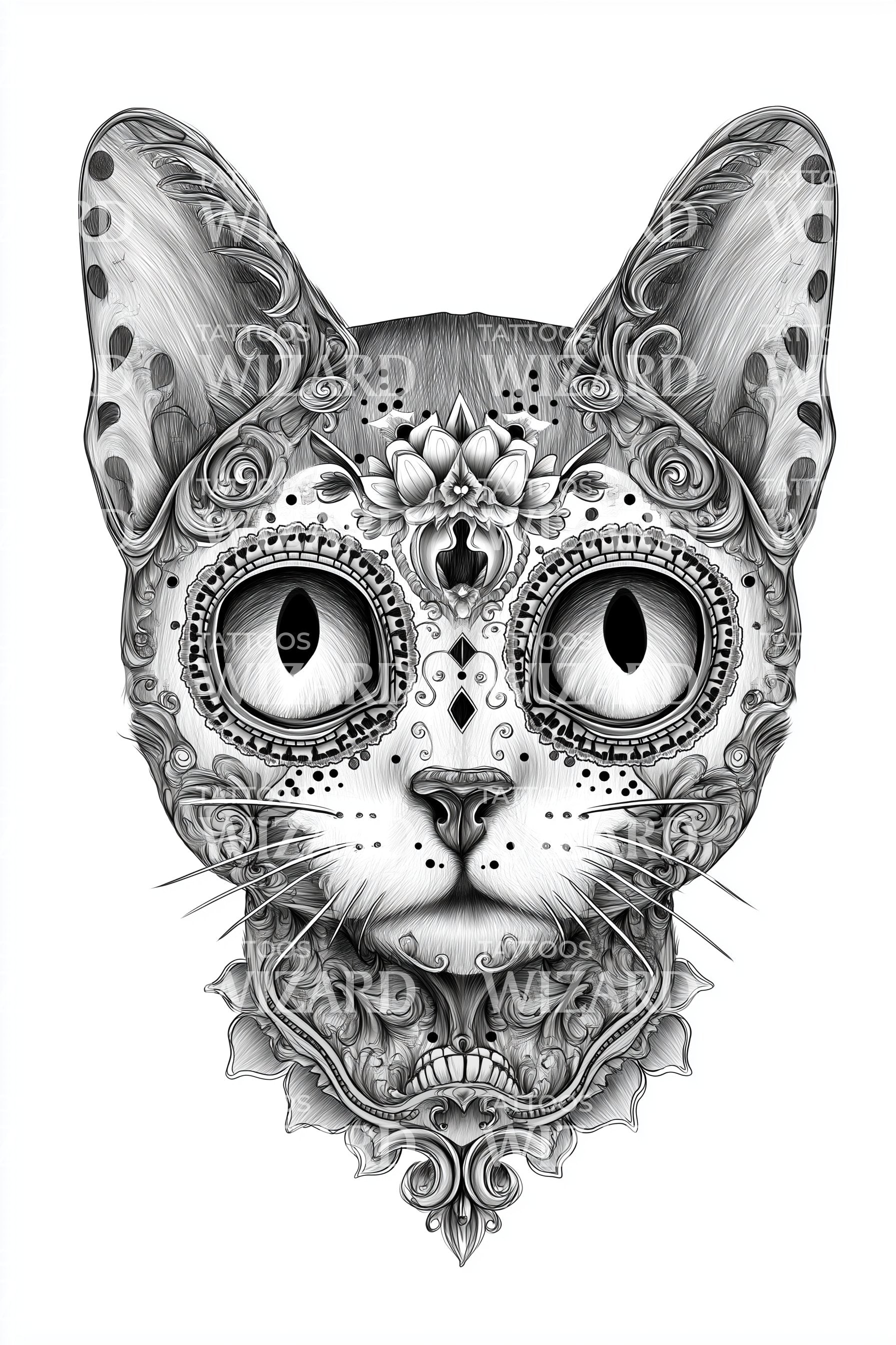 Ornamental cat portrait in monochrome filigree, lotus coronet and mandala-ringed eyes, framed by swirling baroque scrolls and lacework patterns. Symbolizing intuition and steadfast guardianship, the lotus speaks of awakening while wide eyes mirror portals to mystery. Worn close, it inspires regal calm, protective focus, and magnetic, soulful presence.