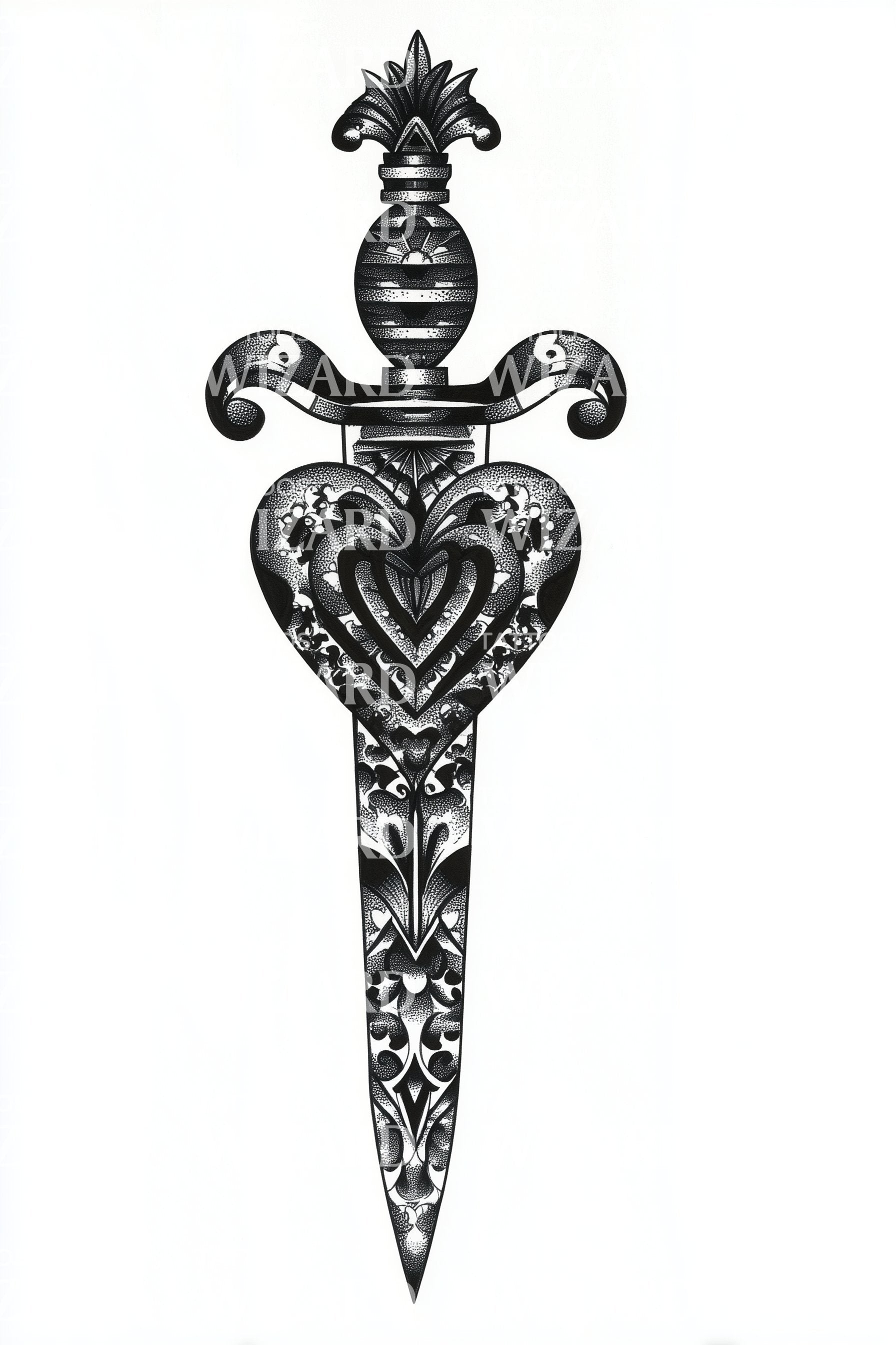 体验这款装饰性匕首纹身设计中武器精通与精致艺术的完美融合。饰以优雅的花丝图案,作品致敬文化遗产,同时保持精致的美学。为肌肤画布带来力量与美丽的奢华宣言。