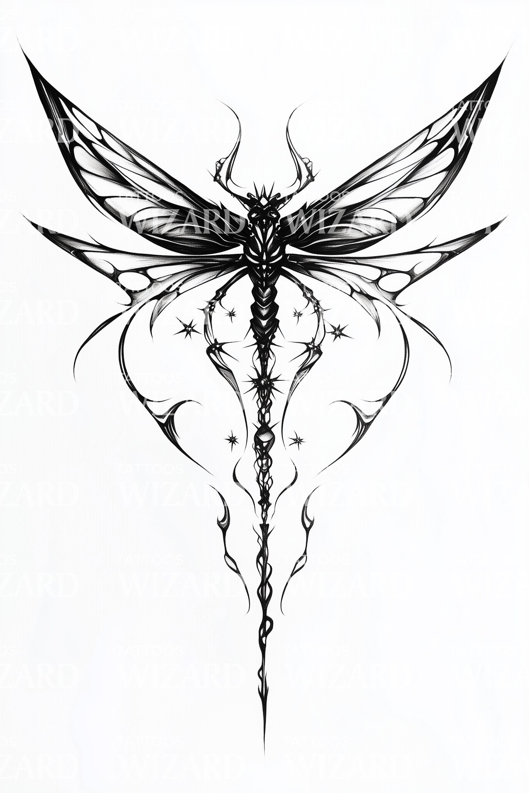 Ornamental night-moth totem spreads filigree wings, blackwork veils and star-pricked arcs framing a slender, daggered spine. Symbol of transformation and nocturnal guidance, this insect talisman follows moonlight, guarding intuition and quiet courage. Wearing it feels like carrying a compass of shadow and shimmer, poised, resilient, beautifully unafraid, always.