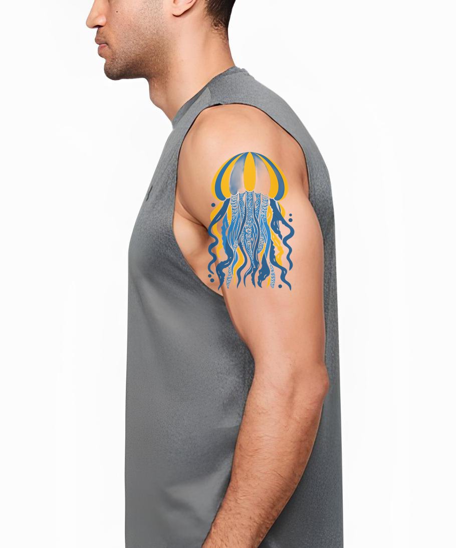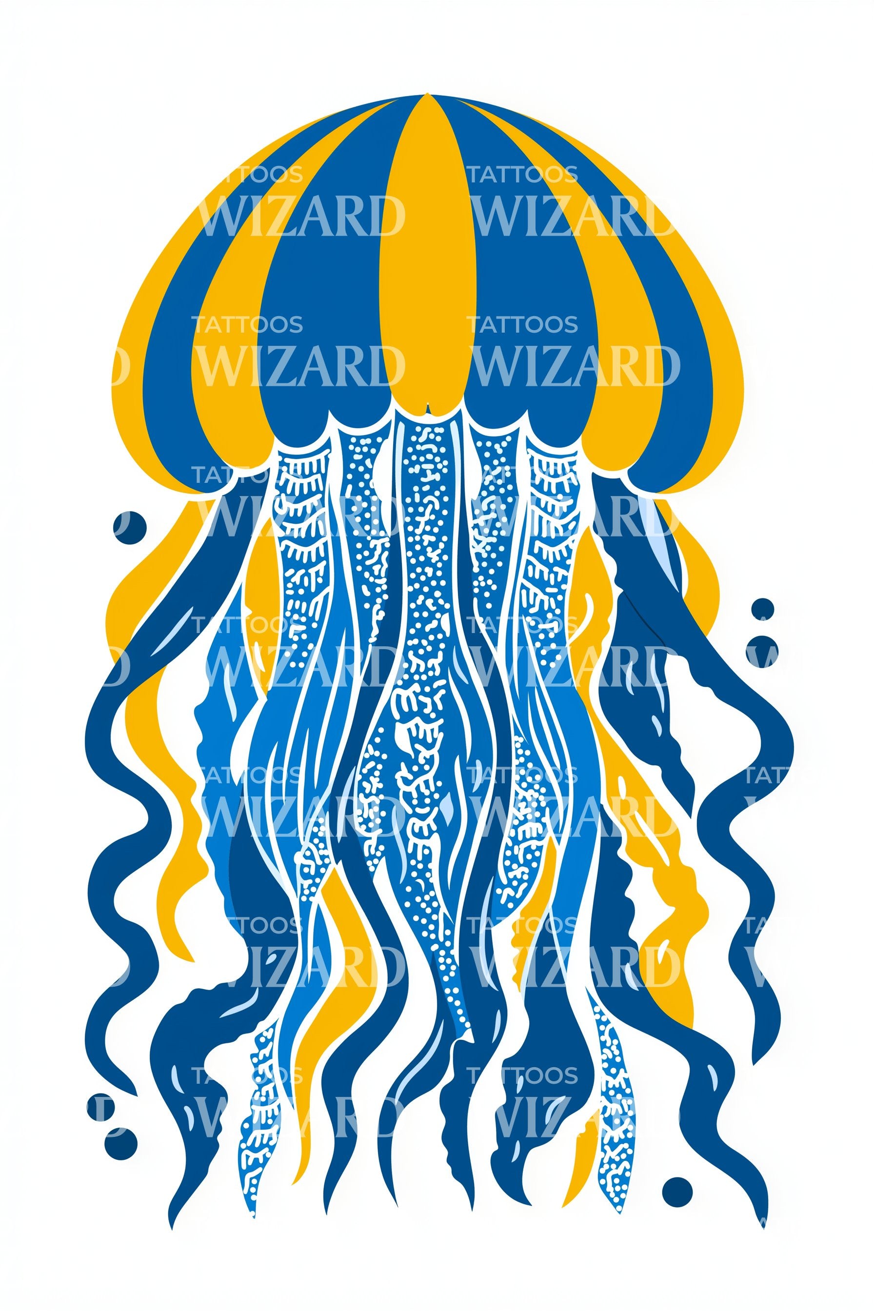 一只飘渺的水母以精致的细节漂浮,其流动的触须形成了受海洋洋流启发的复杂图案。透过细腻的线条,发出蓝色和黄色的光辉,营造出动感与层次感。这是一款优雅而高贵的纹身,专为海洋爱好者设计,平衡了流动性与对称性,展现出迷人的水下魅力与美感。