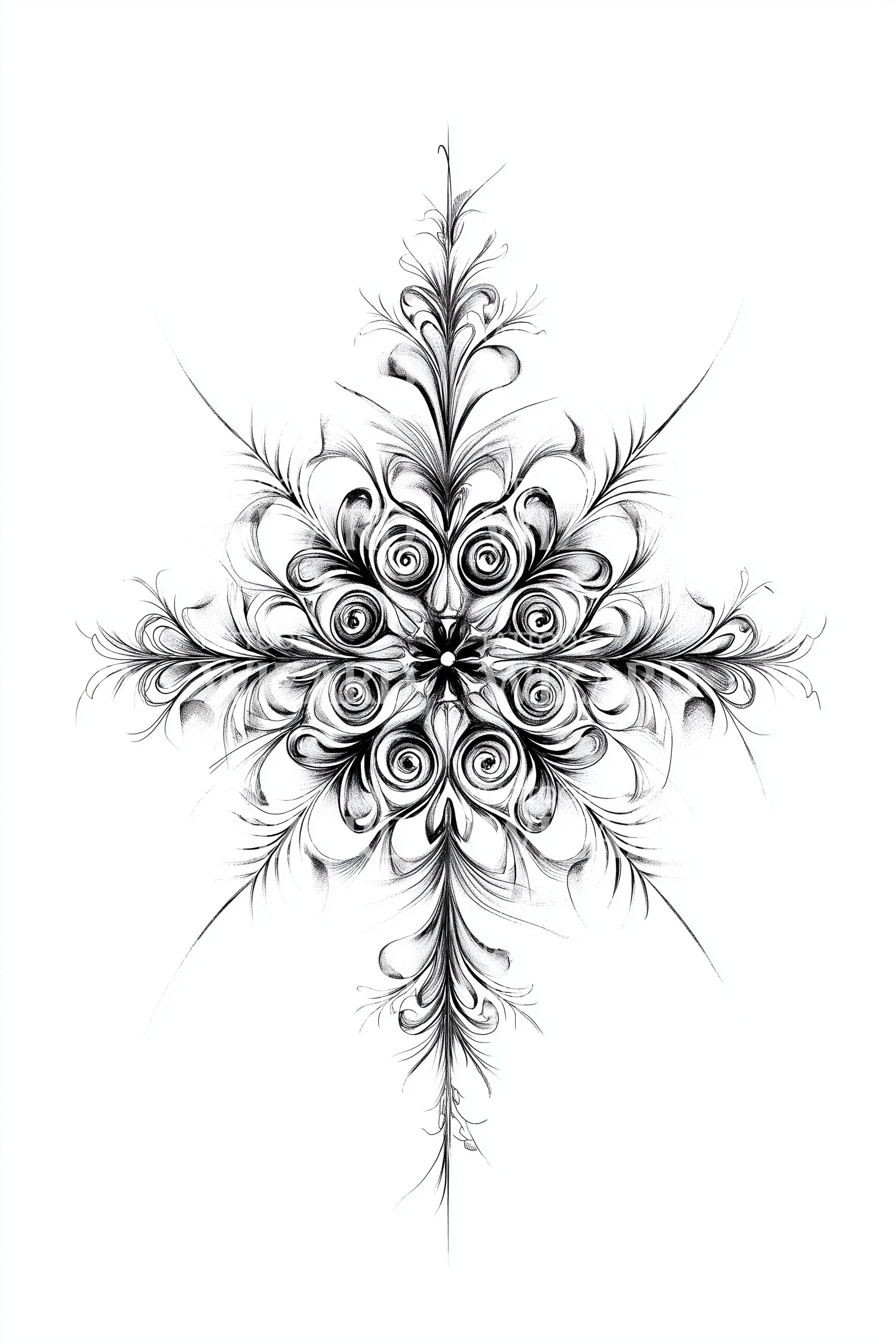 一个优雅的曼陀罗纹身,以精致的玫瑰花为中心,散发出平衡的对称与永恒的宁静。装饰性的卷轴细节穿插于巴洛克式的华丽花纹中,营造出层次感和动感。这个受装饰艺术启发的设计适合前臂、胸骨或背部位置,呈现出融合经典艺术与现代简约线条的精致风格。
