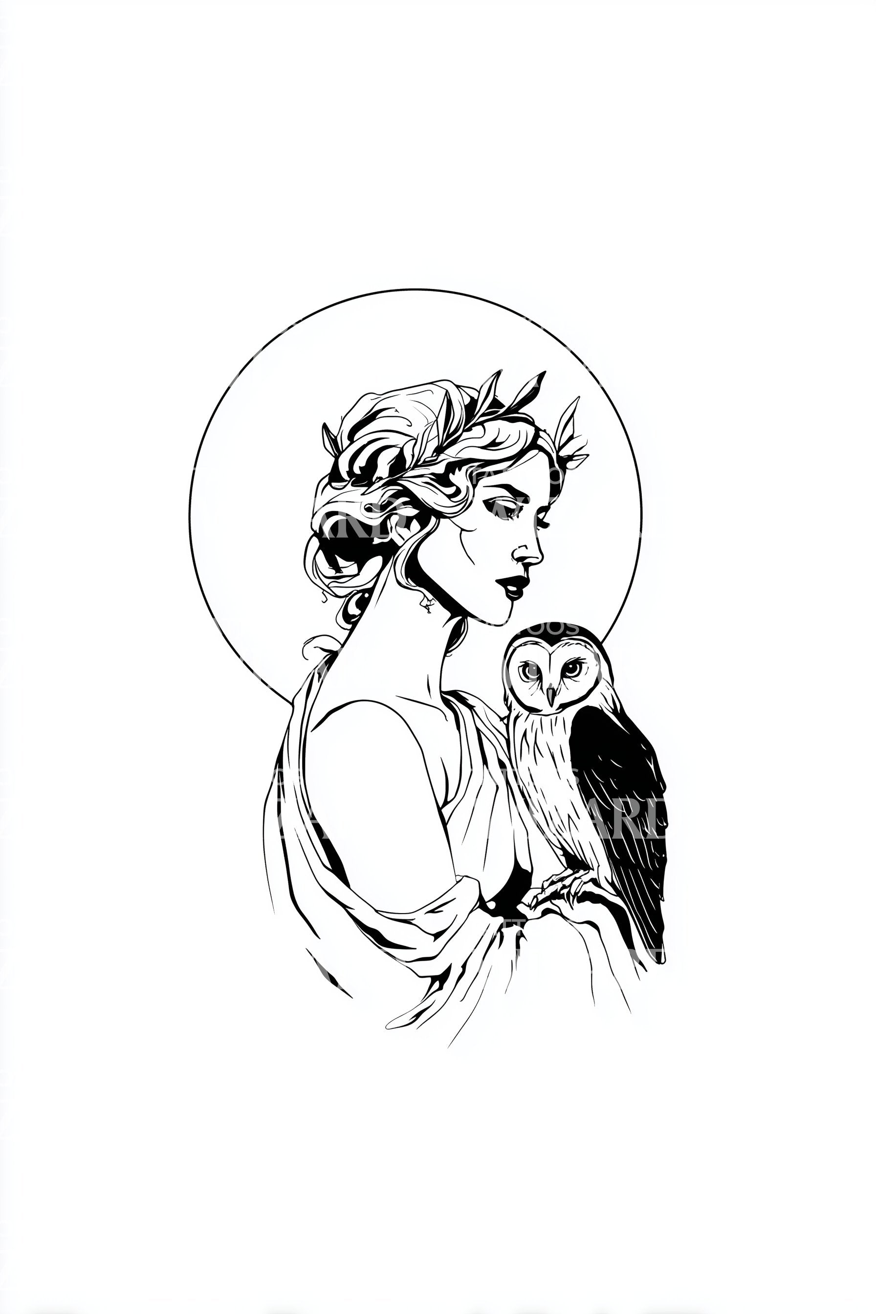 圣洁女性的插画线条肖像,头戴月桂冠与光环,一只猫头鹰警觉地栖息为伴。象征智慧引领勇气,是穿透黑夜的守护存在。佩戴如铠甲,稳固心灵。理想位置:前臂纵向流线,上臂框架,腿肚拉长,背肩映衬光环。
