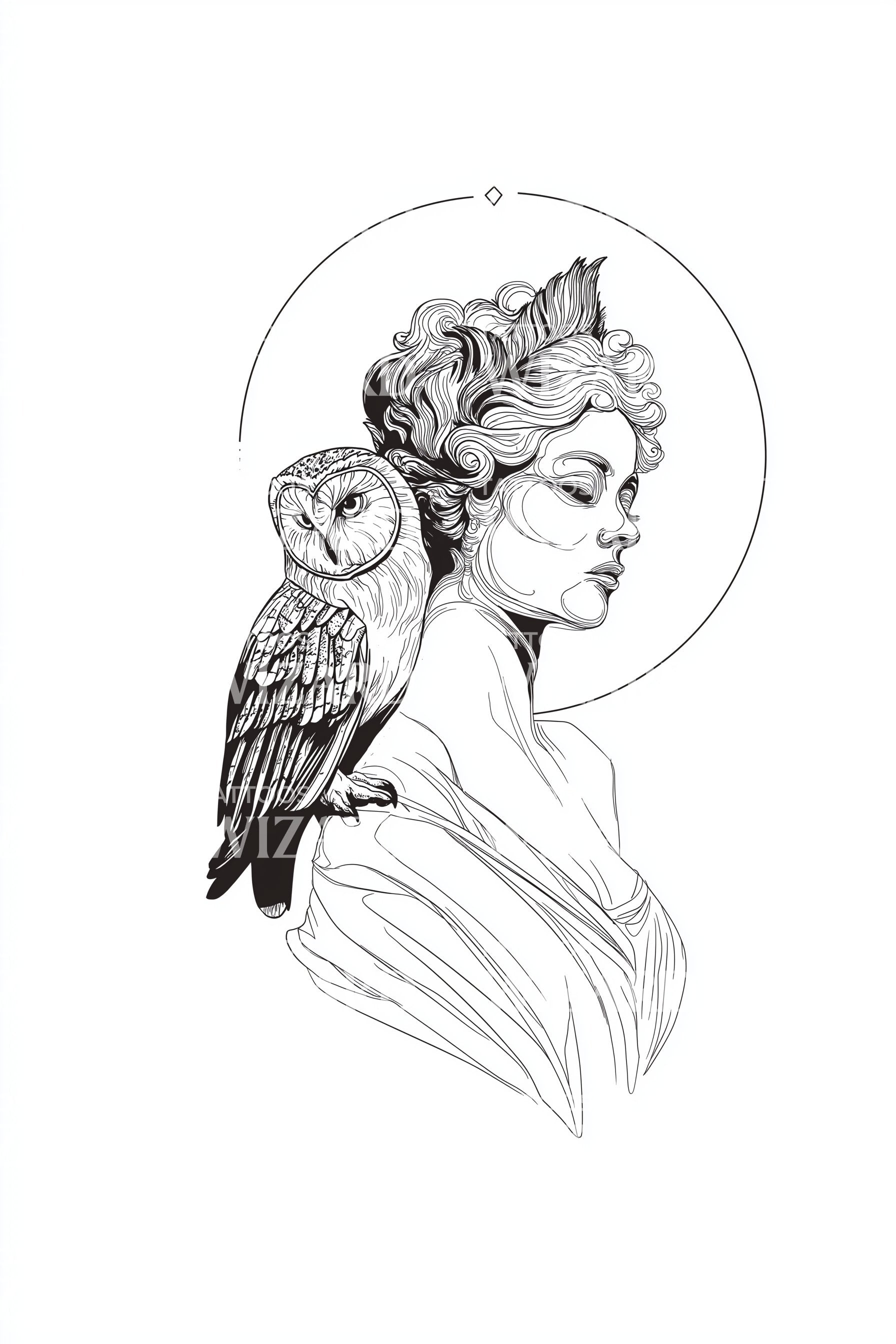 月光下细线描绘的宁静缪斯与警觉猫头鹰肖像,环绕着精致的光环和雕塑般的线条。智慧引领创造力;直觉守护梦想。佩戴时,感受平静与主权。理想位置:上臂适合垂直流动,背部适合光环弧线,前臂适合讲述故事,肋骨处适合私密奉献。