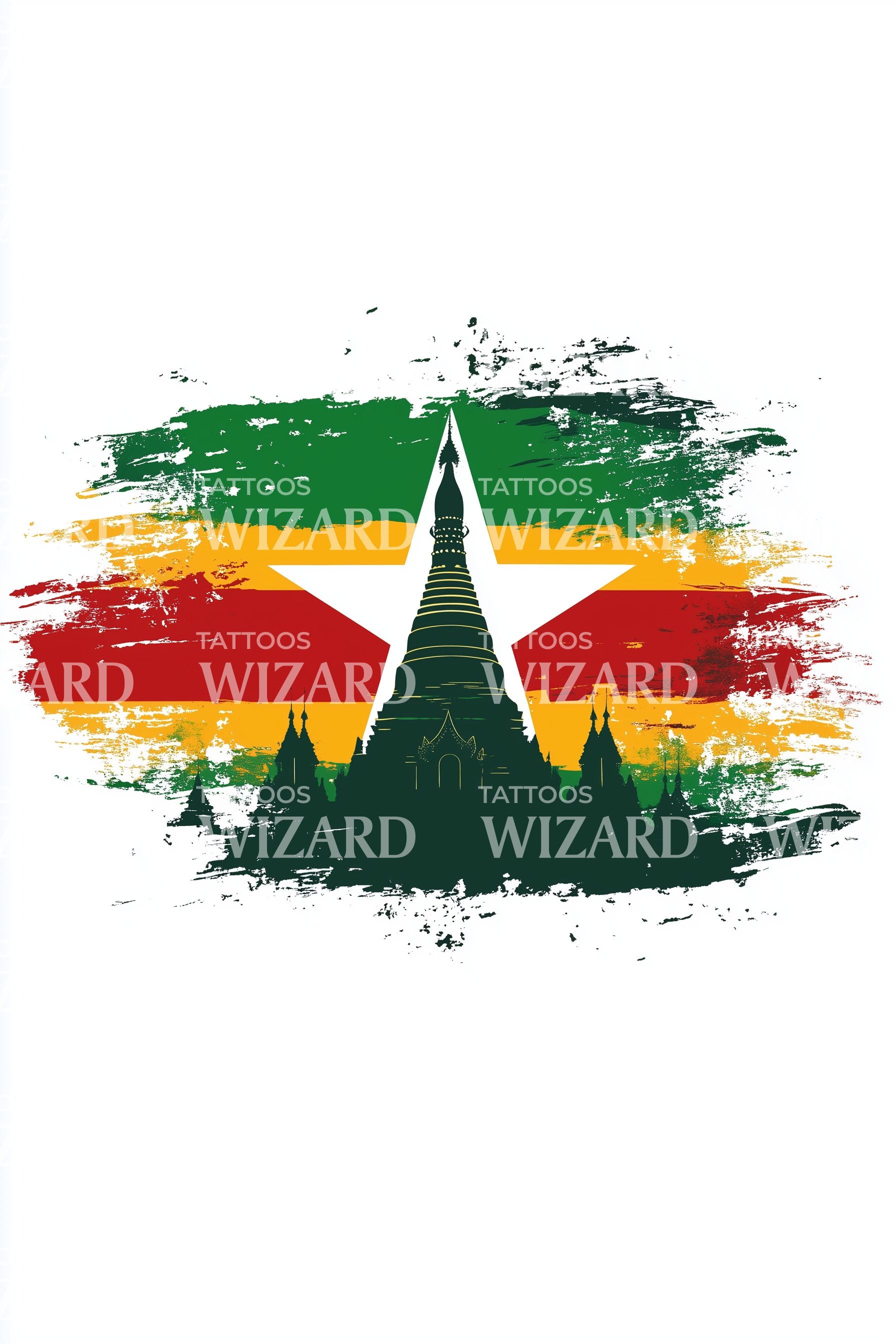 用一款描绘分层宝塔并以绘画风格的旗帜笔触框架的插画纹身,庆祝缅甸的文化遗产。粗糙的刷纹理增添了风化的深度,将神圣的建筑与大胆的色彩融合。非常适合袖子或背部纹身,这款设计在尊重传统的同时,保持现代感和富有故事性的工艺,寓意深远。