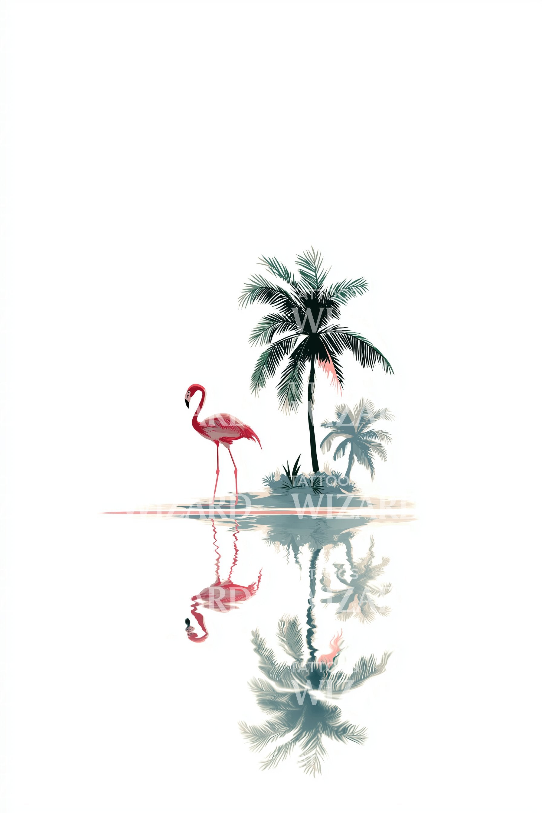 水彩画的棕榈树和珊瑚色火烈鸟栖息在岛屿上,倒映在海岸线上。倒影传达出平衡、宁静与回归平和的意境。热带色调邀请您深呼吸,感受海滩的宁静,放松心灵。适合位置:前臂或小腿呈垂直流动,脊柱呈冥想线条,脚踝展现私密的漫游欲望。