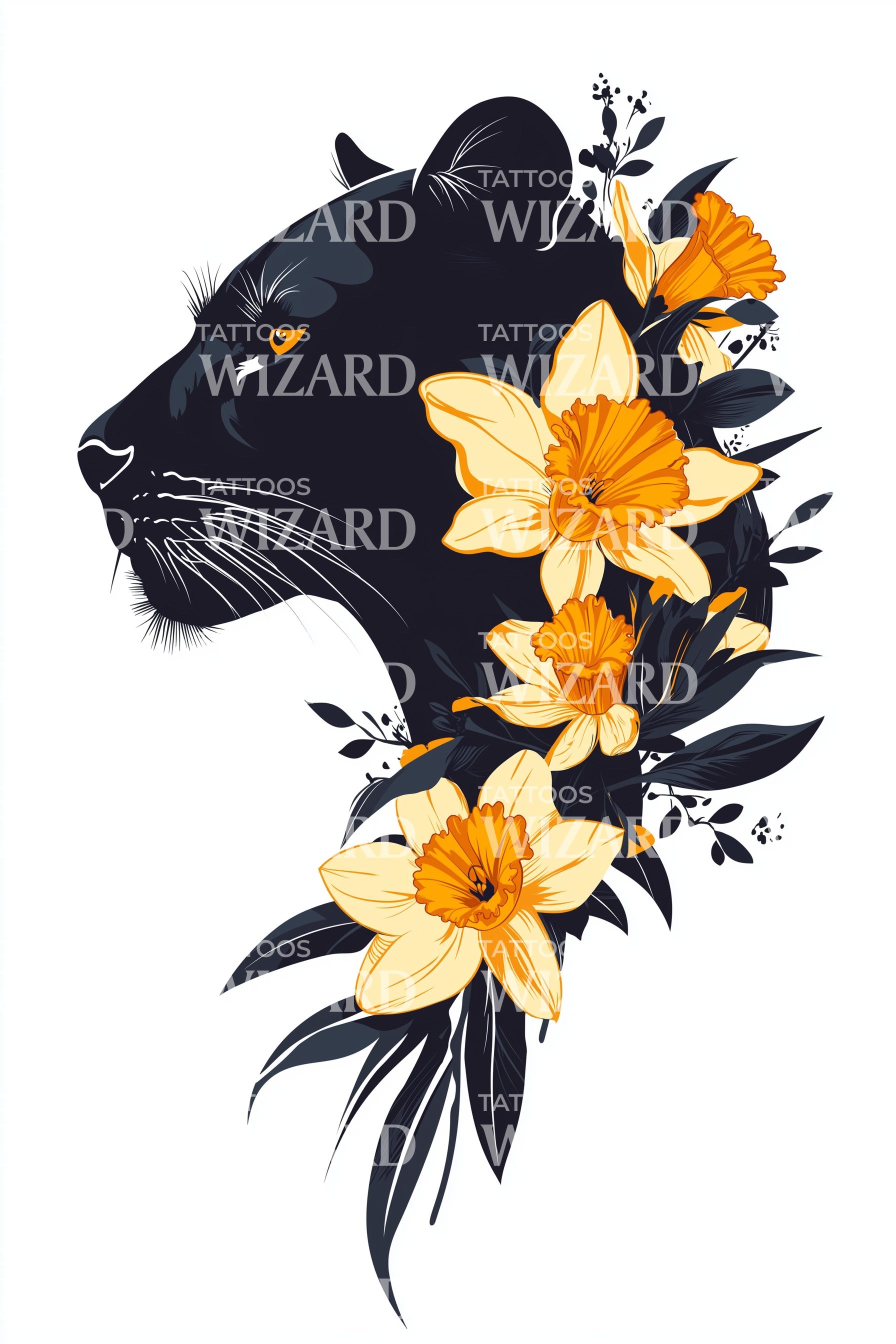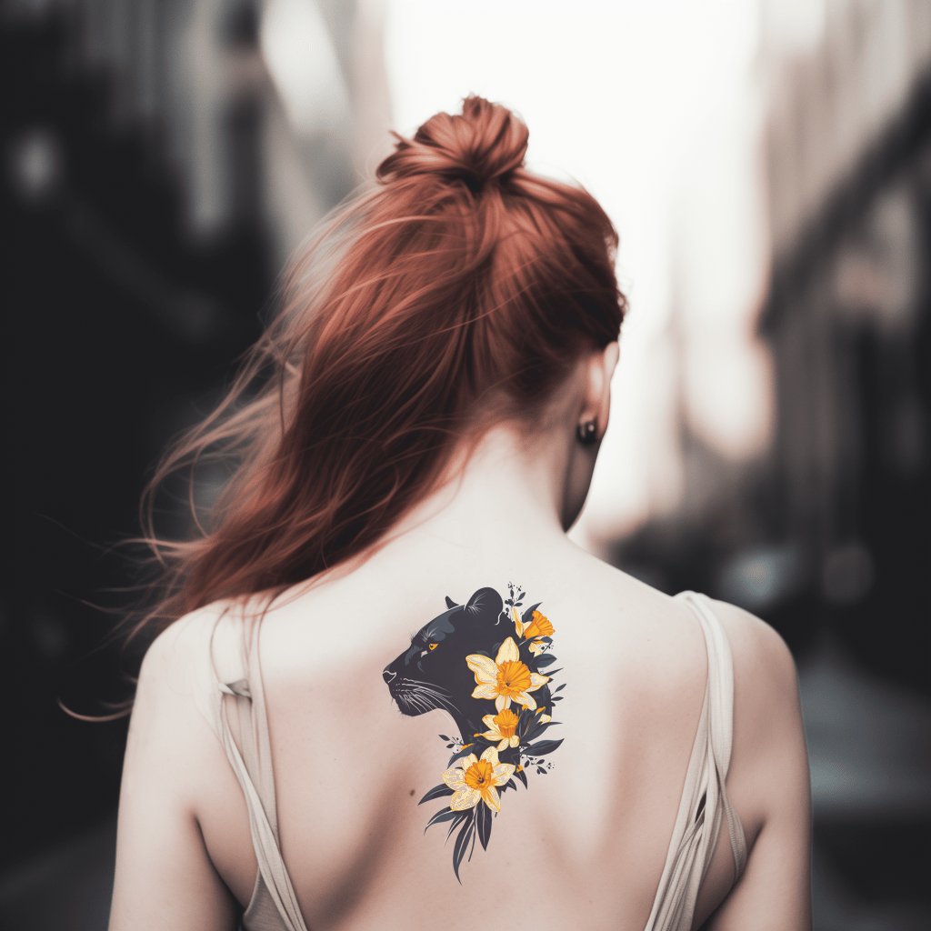 沉浸于这款黑灰纹身设计的野性之美。威严地展现出一只凶猛的黑豹,环绕着一簇引人注目的花卉图案。其高对比度增强了视觉冲击力,完美融合了原始的动物力量与花卉的优雅。非常适合喜爱大胆且复杂黑灰纹身的人士。