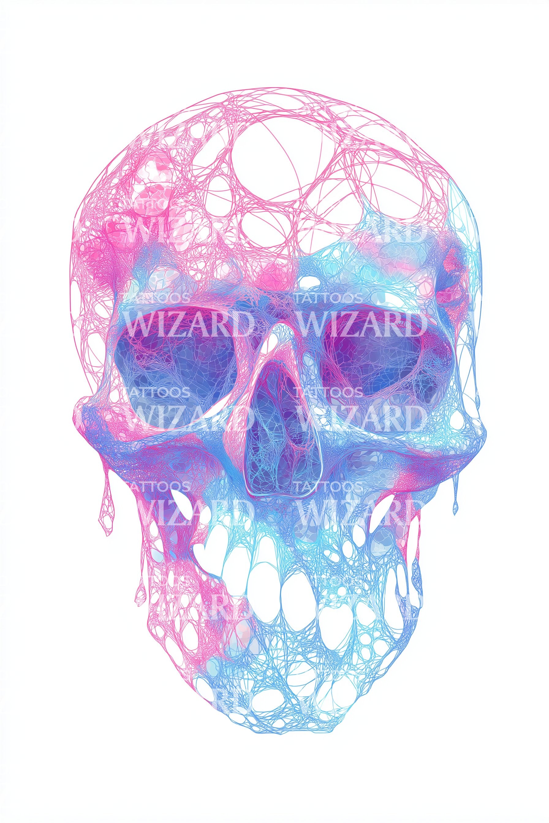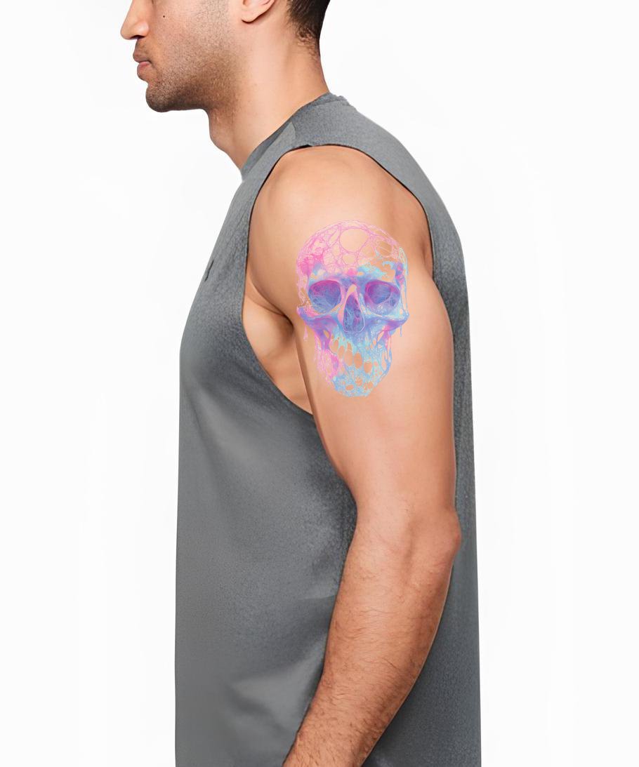 沉浸于这款水彩纹身设计的耀眼魅力中。巧妙描绘的骷髅图案融合抽象元素,营造出迷幻的意象。充满鲜艳的柔和色调,这款纹身是大胆与明亮的完美结合,专为那些被神秘与多彩所吸引的人而设计!