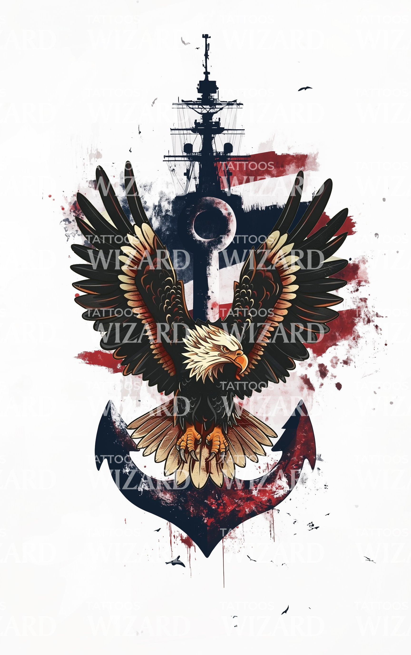 体验一首对美国勇气的爱国颂歌,尽在我们的新传统纹身设计中。展示出引人注目的元素,如自由展翅的鹰、标志性的美国海军锚和雄伟的美国国旗。这个美观的设计沉浸在国家的军事历史中,庆祝自由与坚韧。
