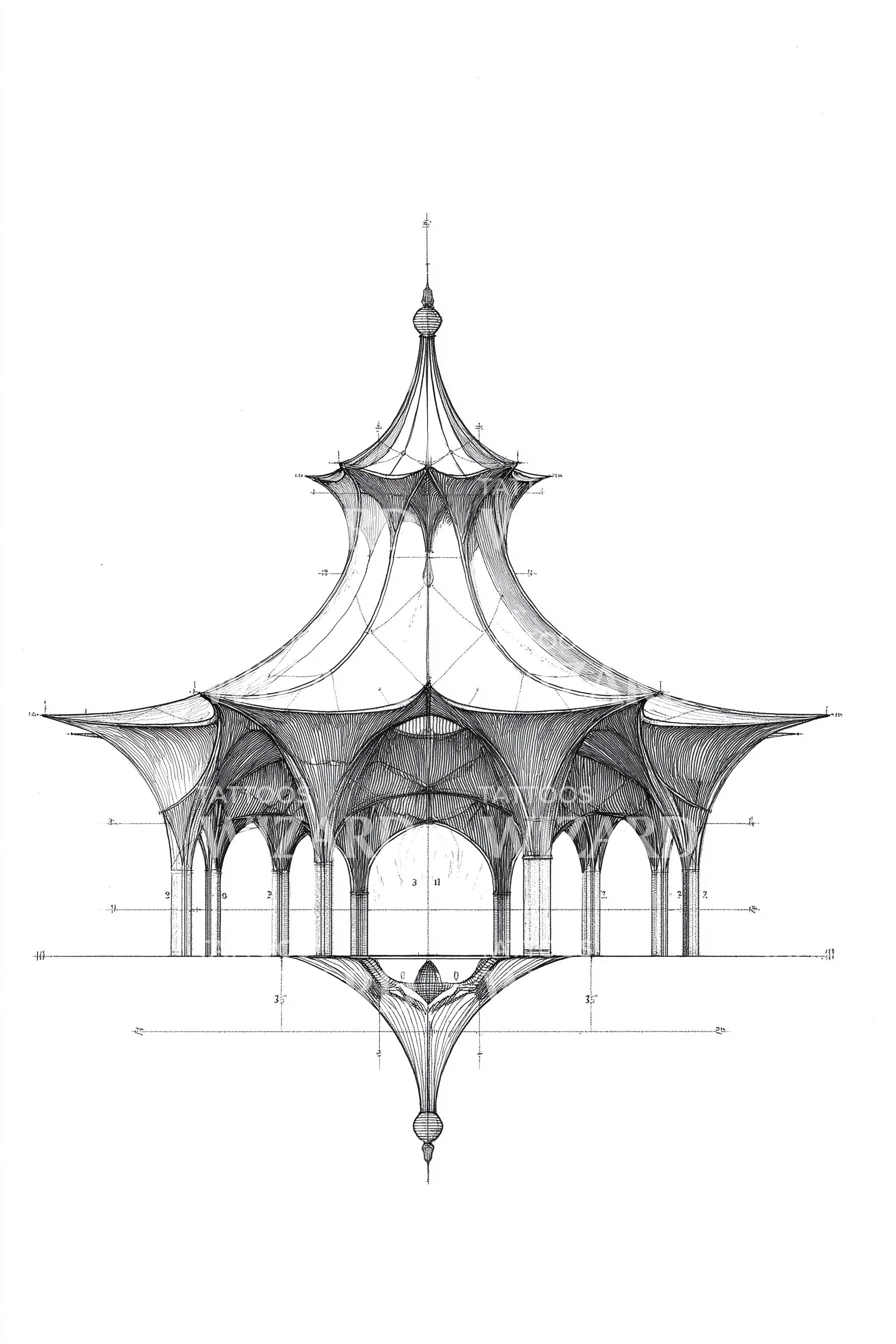 这款复杂的几何纹身设计展现了亭阁与装饰性建筑的迷人融合。它是一件精美的黑色纹身作品,完美诠释了艺术与对称的结合。非常适合欣赏结构与优雅在宏伟几何风格中融合的人士。