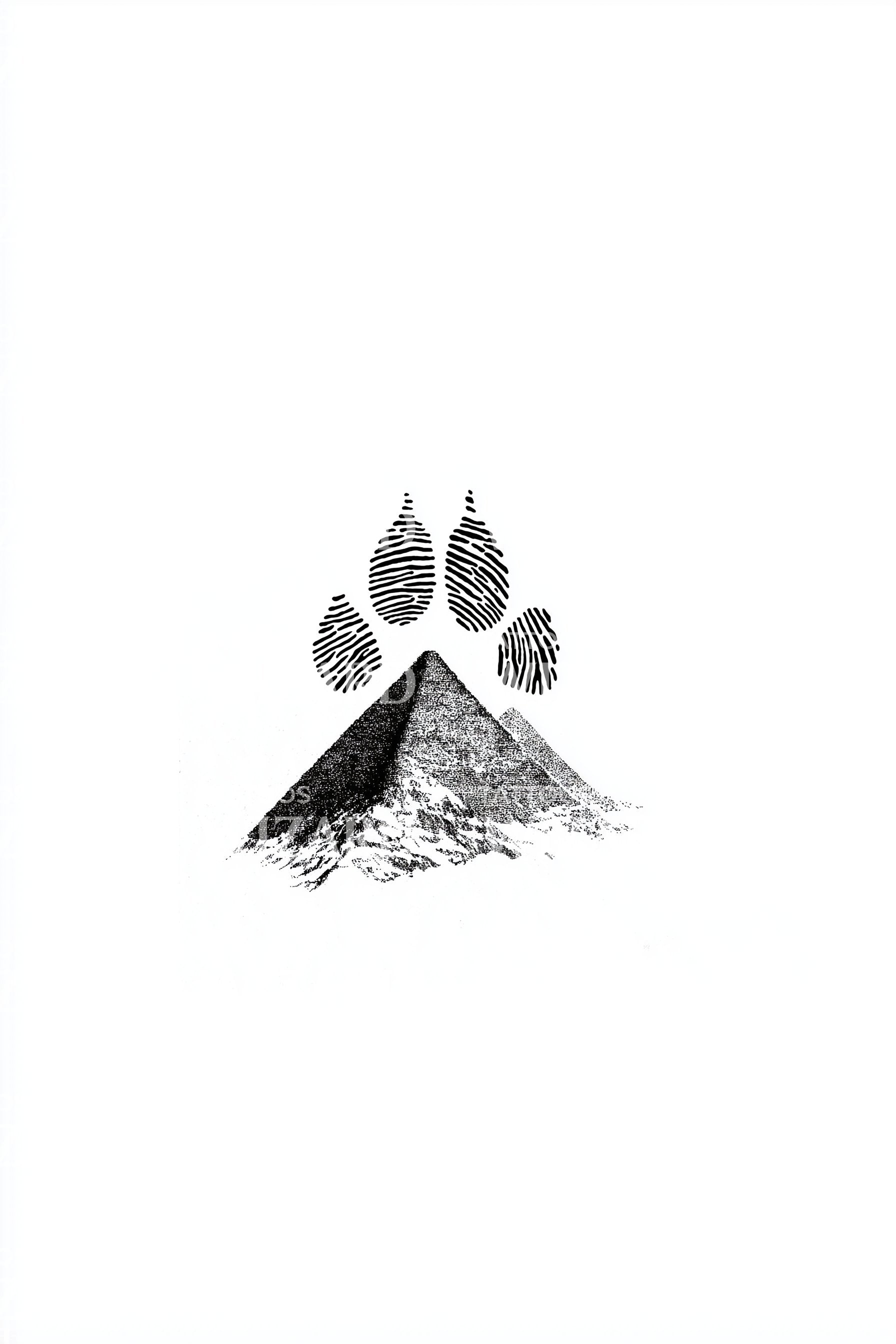 Blackwork summit rises in stippled gradients, crowned by a fingerprint paw. Mountain speaks of high paths, the paw honors a loyal trailmate and the wild within. Wearer feels steady, brave, and guided. Ideal placements: forearm for vertical climb, calf for stride, sternum for heart-journey, shoulder blade for sweeping ascent.