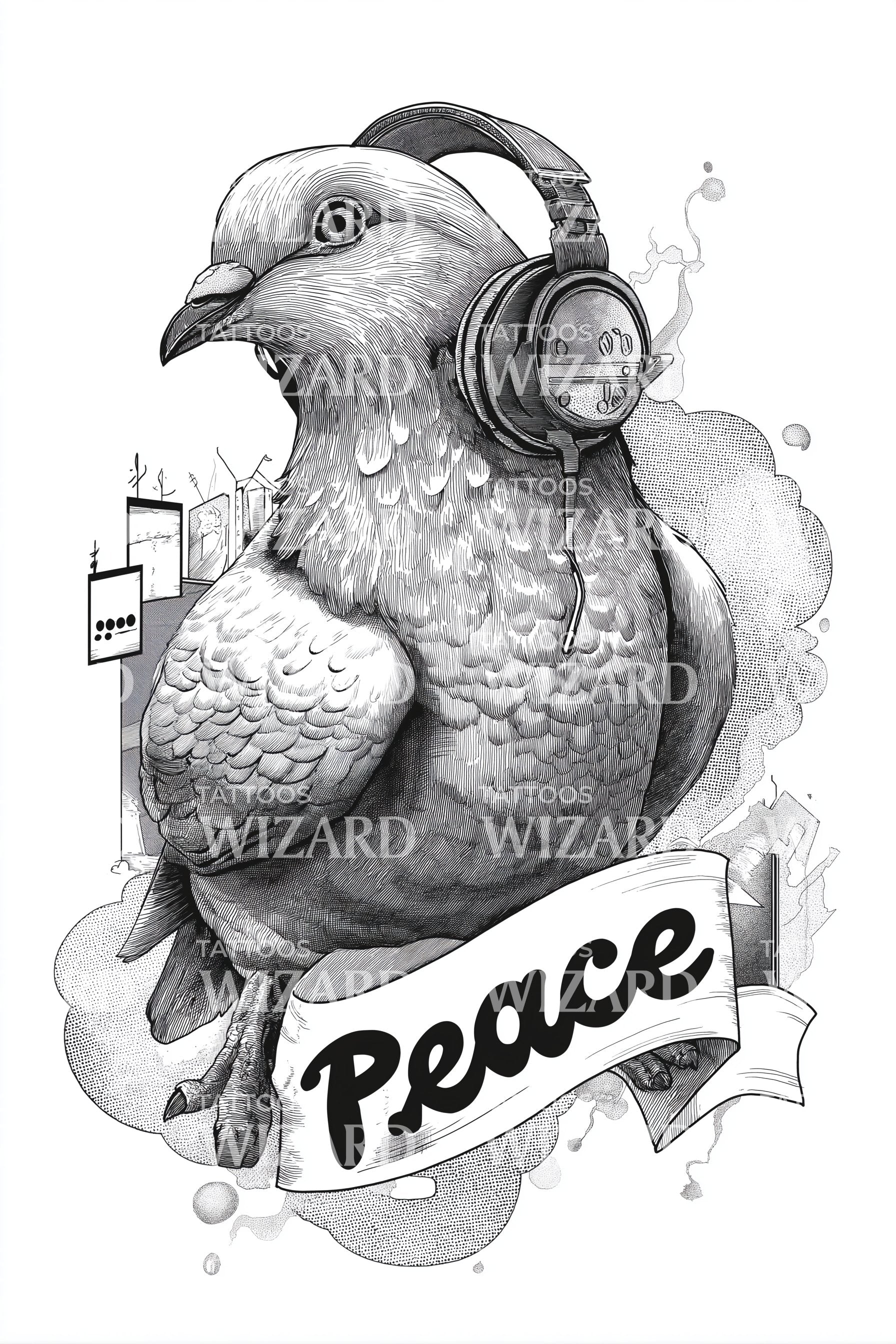 用我们的新潮纹身设计展示你对和平与音乐的热爱。设计中一只戴着耳机、充满街头风格的时尚鸽子,生动地象征着和谐与自由,采用鲜明且富有张力的笔触呈现。对于任何想要散发酷感与宁静的人来说,这绝对是必备之选。