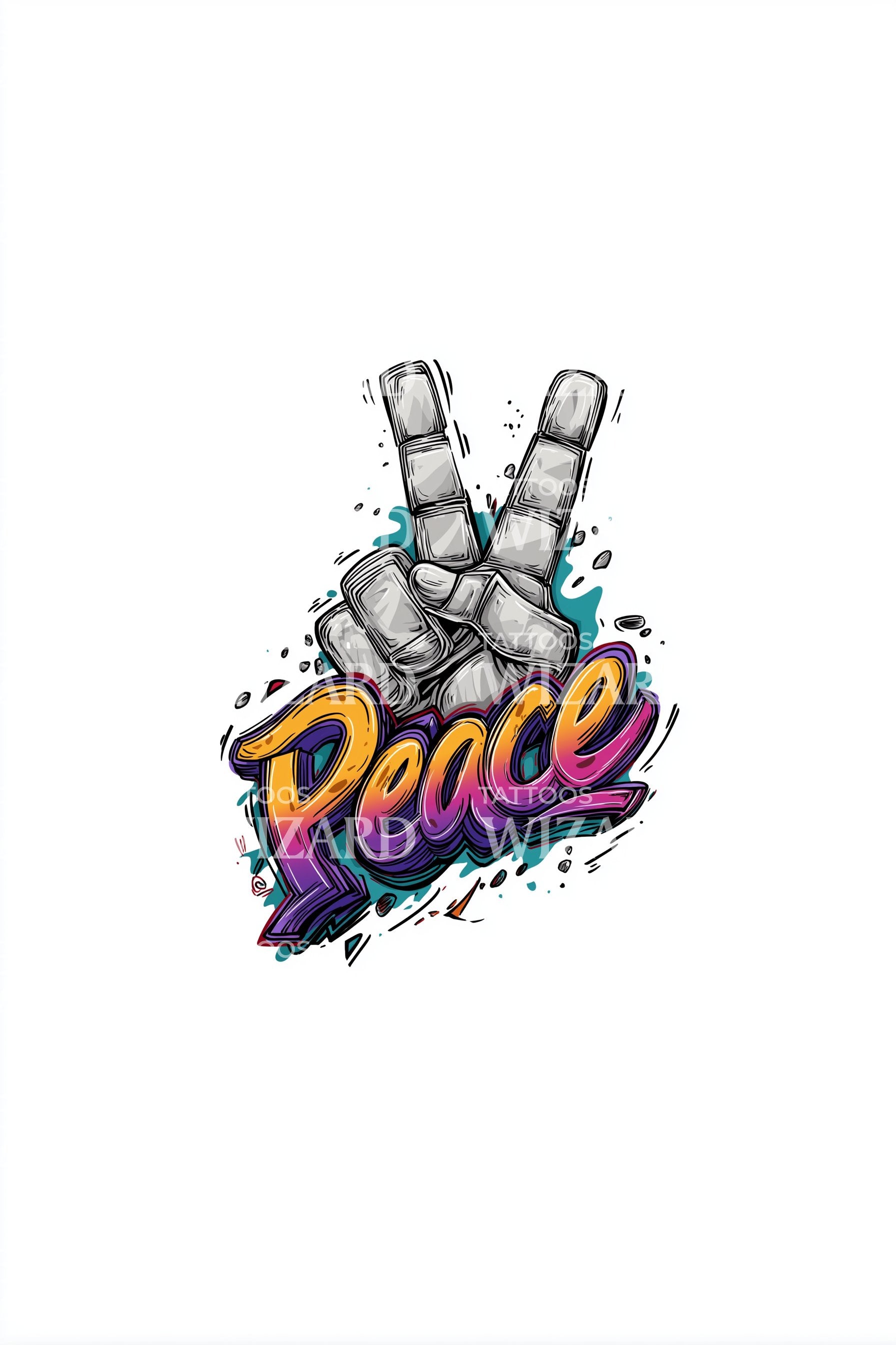 Neon-splashed newschool energy explodes in a chrome peace-sign hand above graffiti Peace lettering, blending magenta, orange, and teal with ink flicks. The V symbolizes peace and truce in chaotic streets, a promise to speak softly yet stand strong. Wearer feels uplifted, centered, and city-ready, radiating calm, colorful urban vibes.