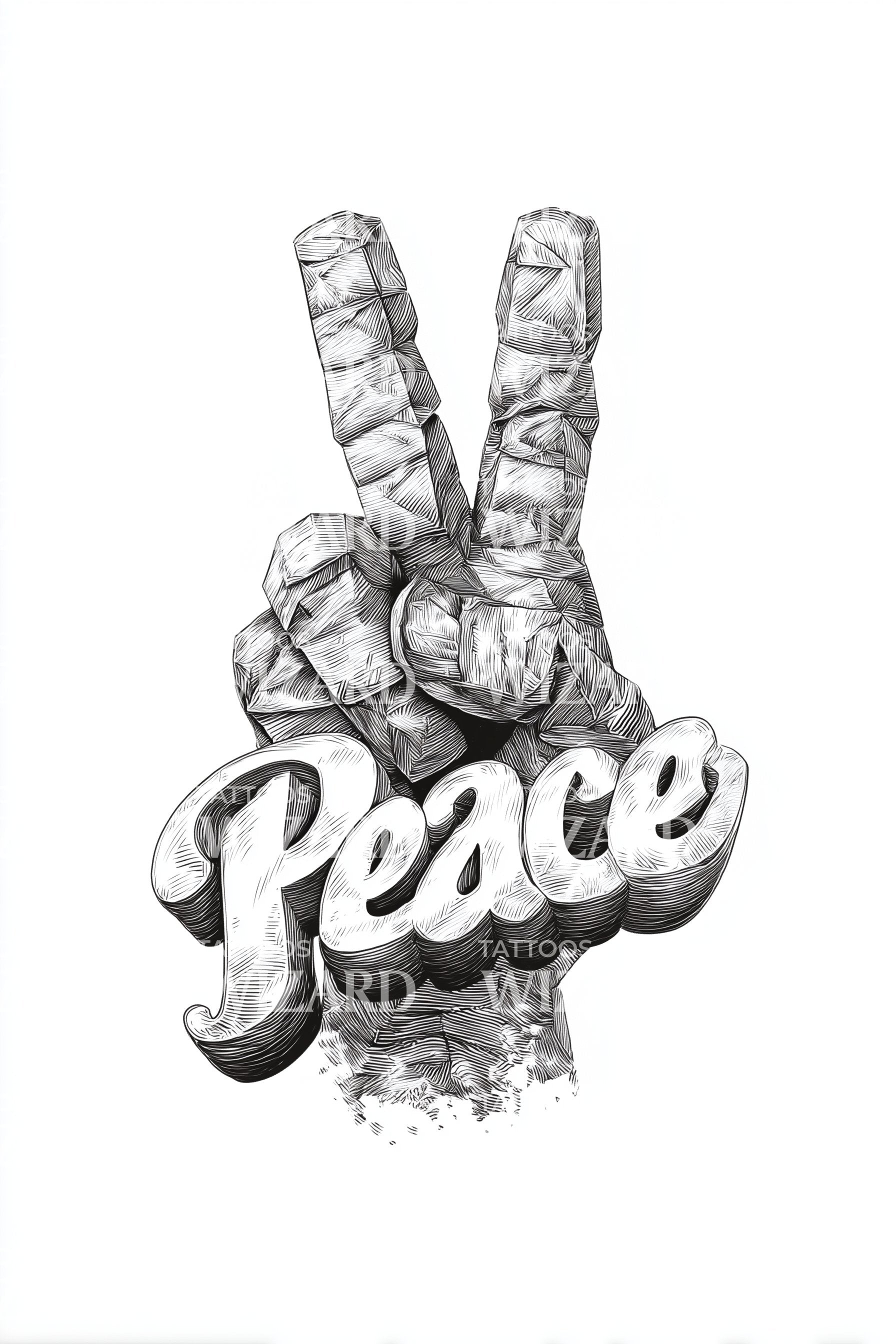 Stone-cut realism renders a raised hand flashing the V-sign, each facet etched with fine crosshatching, anchored by bold script reading Peace. The gesture unites victory and calm, a pledge to choose harmony. Wearing it feels grounding, brave, and quietly defiant, a daily reminder to lift kindness higher.