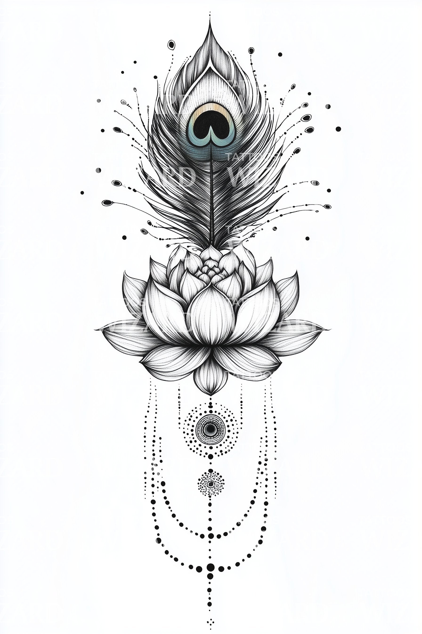 用我们装饰性的纹身设计装点你的肌肤,设计中生动的孔雀羽毛绽放成宁静的莲花。这款图腾设计巧妙地融合了象征性的眼睛与精细的细节,提升你的美丽与个人表达。独特的作品,映照你的个性。