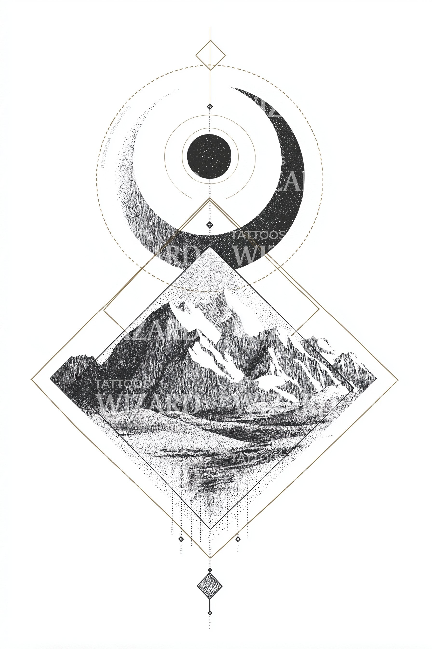 Sacred geometry frames mountains within intersecting diamonds, dotwork valleys pointing toward a lunar crescent and a cosmic sphere in precise orbit. A central axis forms a compass to the highest peak. Meaning alignment, endurance, and quiet wonder, this piece feels like steady altitude for the soul every day.