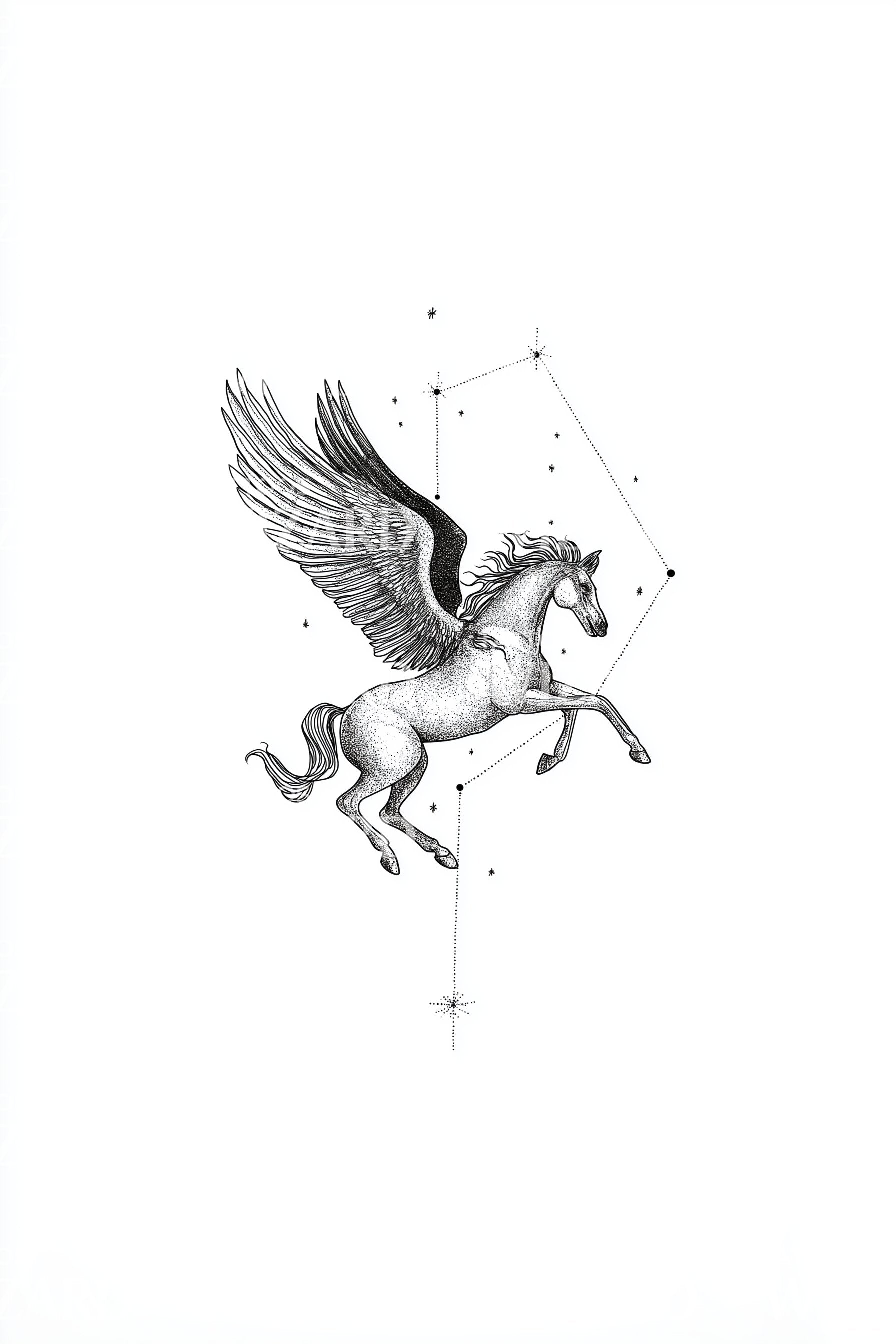 Fineline Pegasus ascends through a dotted constellation, feathered wings carved in delicate stipple and bright star points. This celestial horse symbolizes freedom guided by cosmic maps, courage harnessed to wonder. Wearing it feels like night air in your lungs, steady lift, purposeful direction, and infinite sky within.