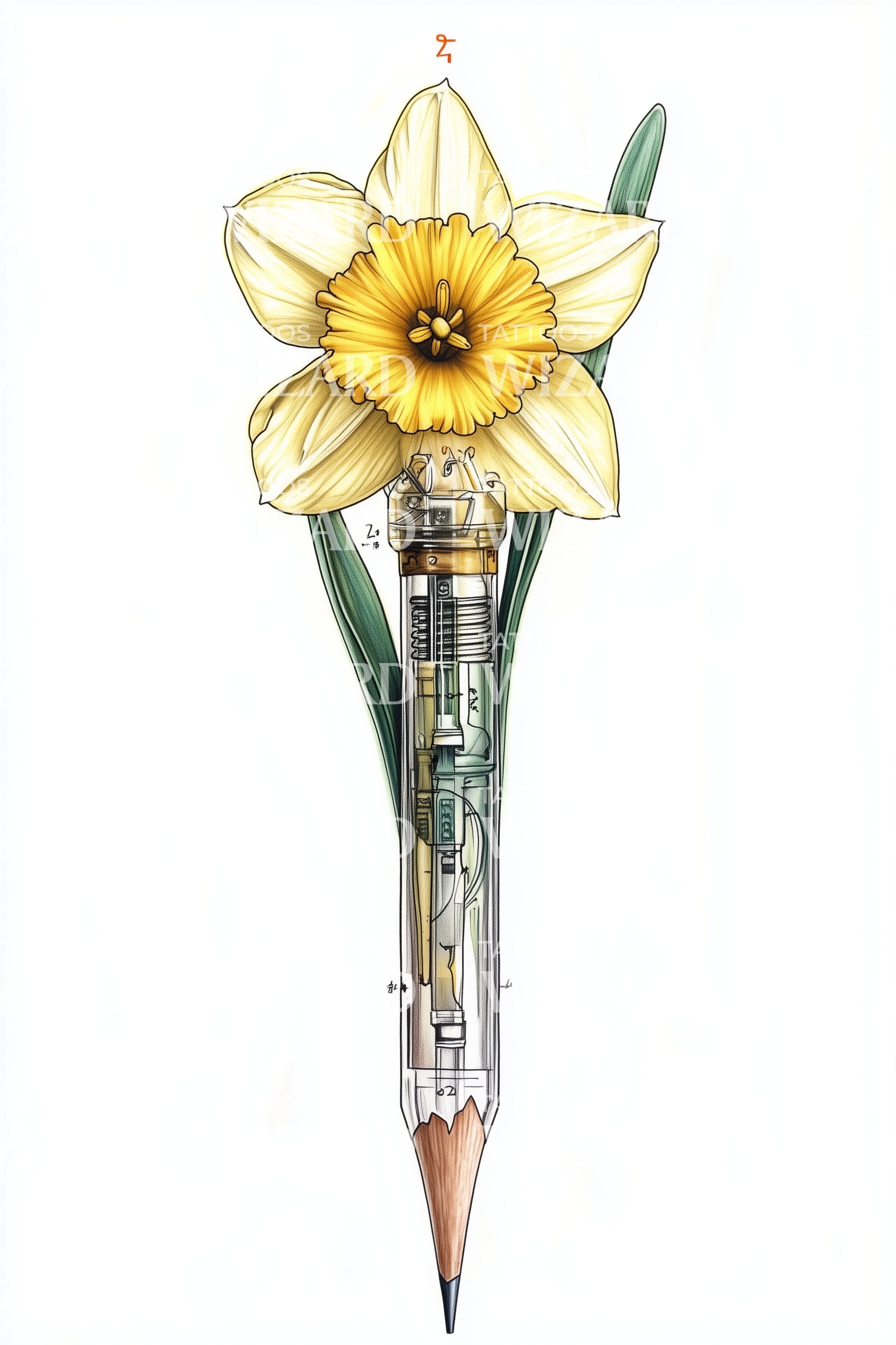 这款精美的纹身设计巧妙地融合了写实插画与一丝创意。水仙花以铅笔细腻勾勒,展现出无与伦比的优雅与清新。非常适合欣赏大自然之美与艺术精准完美结合的人士。这不仅仅是一款纹身;它是自我表达的工具。