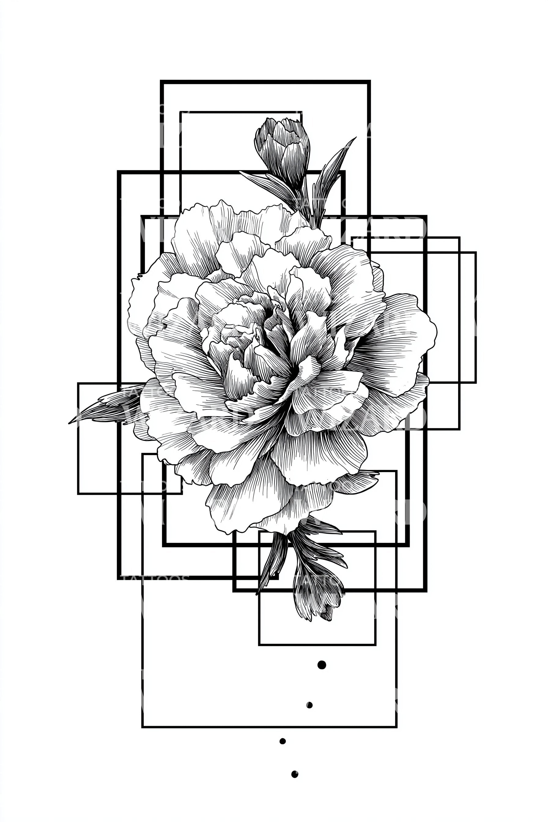 体验自然与几何的和谐融合,这款现代纹身设计展现了独特风格。设计中精致的牡丹花瓣碎片被简洁的矩形包裹,作品散发出独特韵味。此设计将有机之美与当代美学相结合,将你的肌肤转变为引人入胜的画布。