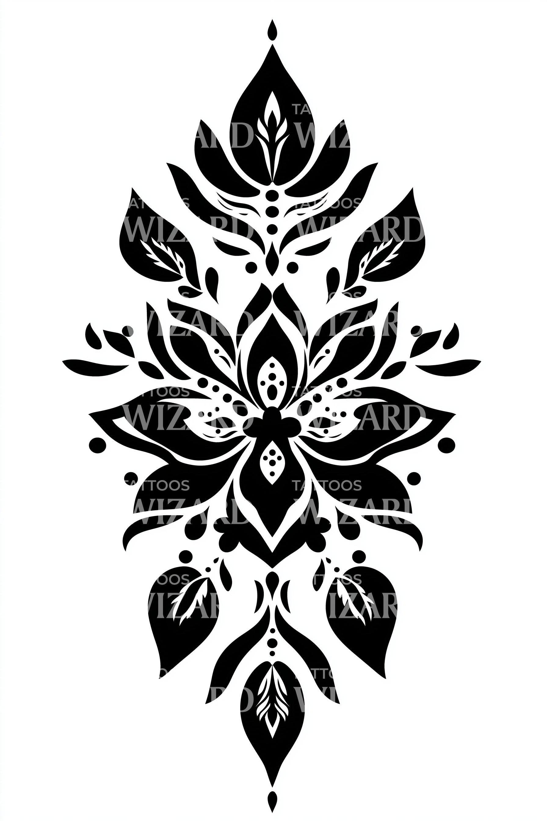 这款优雅的黑灰纹身设计巧妙地将装饰性徽章与精致的花瓣融合成迷人的花卉图案。通过强烈的对比和复杂的细节,它捕捉了自然生长之美的艺术体现,诗意地模糊了有机与装饰之间的界限。