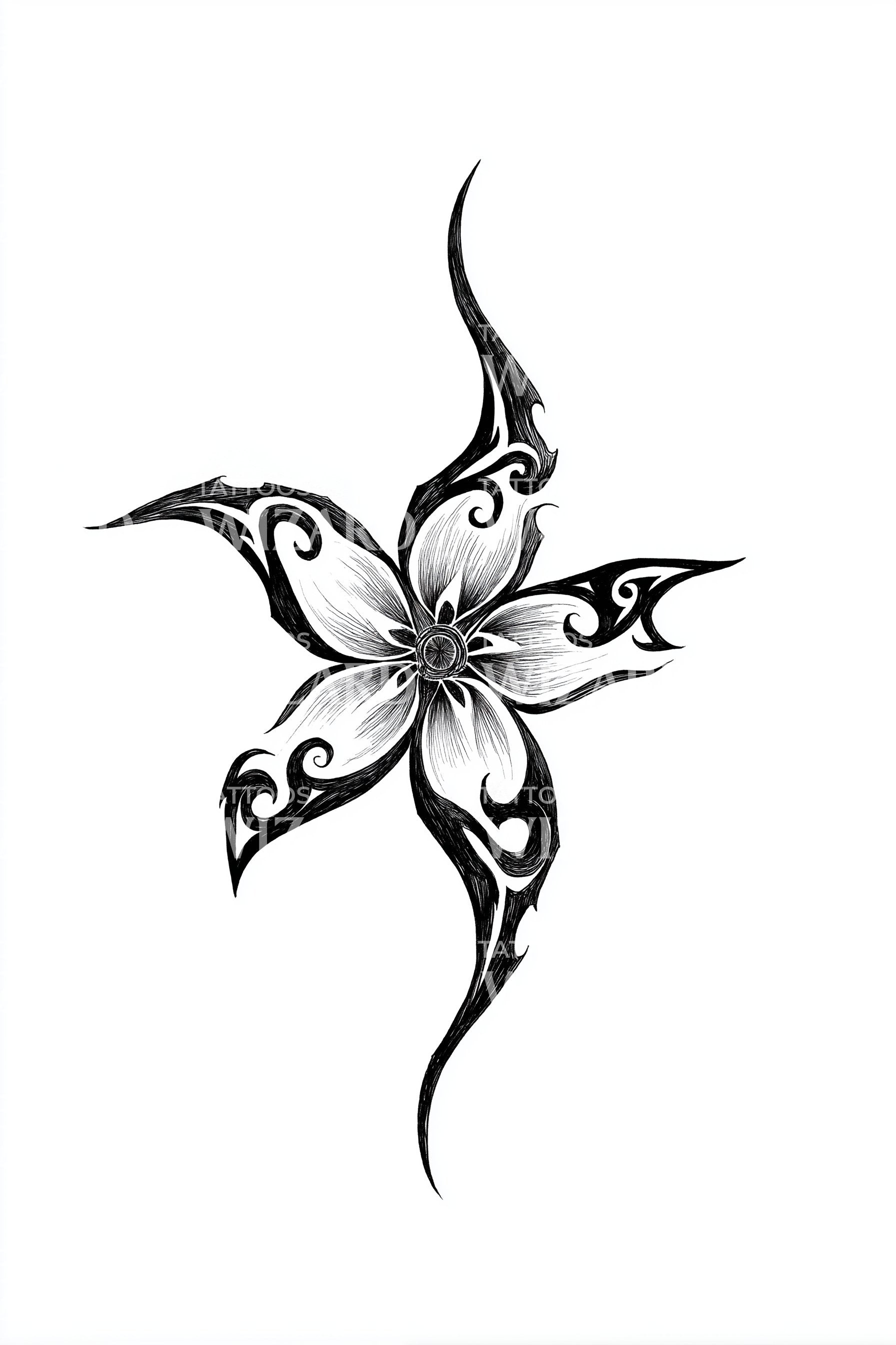 释放你的灵魂,选择我们的部落纹身设计,花瓣、星星和漩涡图案在锐利而大胆的线条中交织。这款设计巧妙地融合了部落美学与花卉元素,创造出独特的和谐与刚烈的结合。非常适合以精致而优雅的风格表达大胆叛逆的精神。