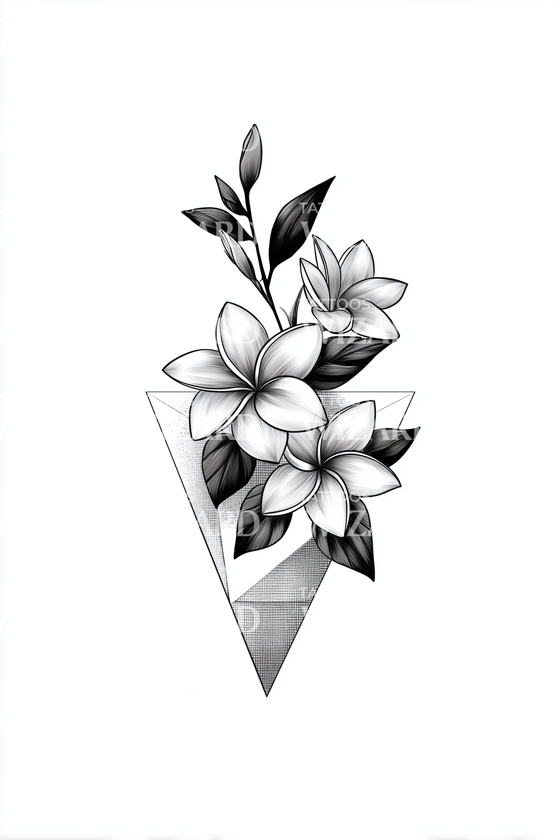 用我们精致小巧的茉莉花纹身设计装饰你的肌肤。几何线条巧妙地勾勒出一个三角形,优雅地衬托着盛开的花朵。这个设计完美展现了茉莉花的优雅,增添了时尚且现代的韵味。迷人的对称美学与花卉元素相融合,打造出一件真正惊艳的艺术品。