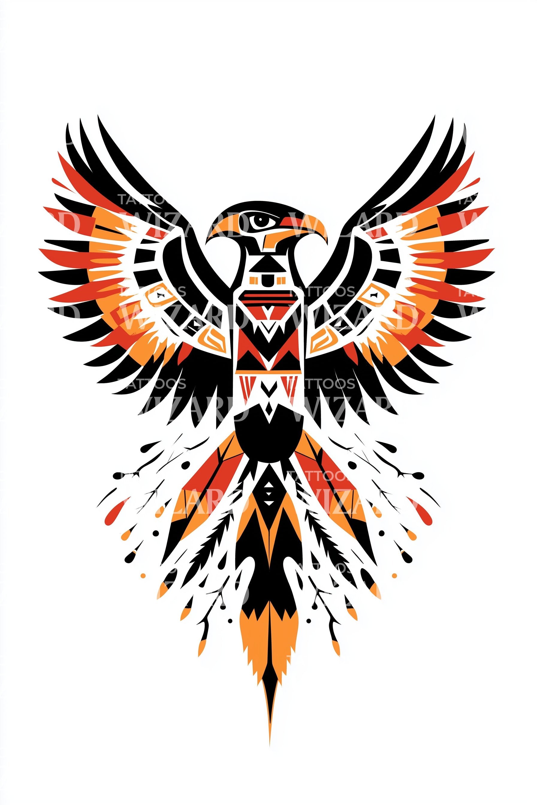 凤凰与鹰的融合在新潮图形色彩中燃烧,角状羽毛与墨迹飞溅的余烬,黑色、橙色和红色点燃飞翔。象征重生、远见与勇气,穿越火焰翱翔。佩戴者感受坚不可摧,奋起飞升。理想位置:上背展翼,胸部燃心火,胸骨或前臂呈现垂直流动感。