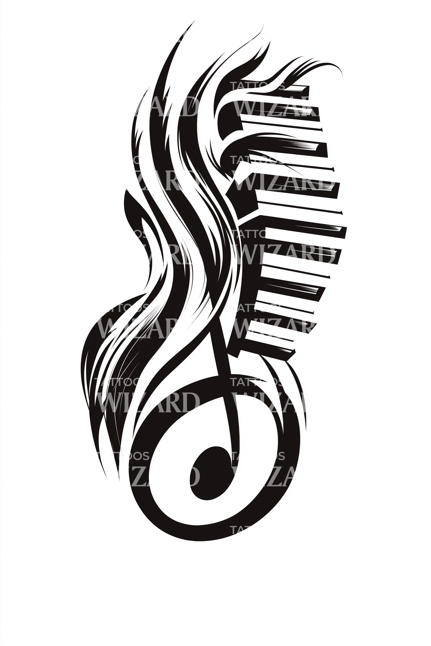Ornamental blackwork unfurls as a treble clef cradling piano keys, hair-like swirls flowing upward. Symbolizes harmony between mind, body, and music, where intuition and discipline braid. Worn, it feels lyrical, confident, and alive. Ideal placements: forearm or calf for vertical flow, spine for ascent, ribs for intimate cadence.