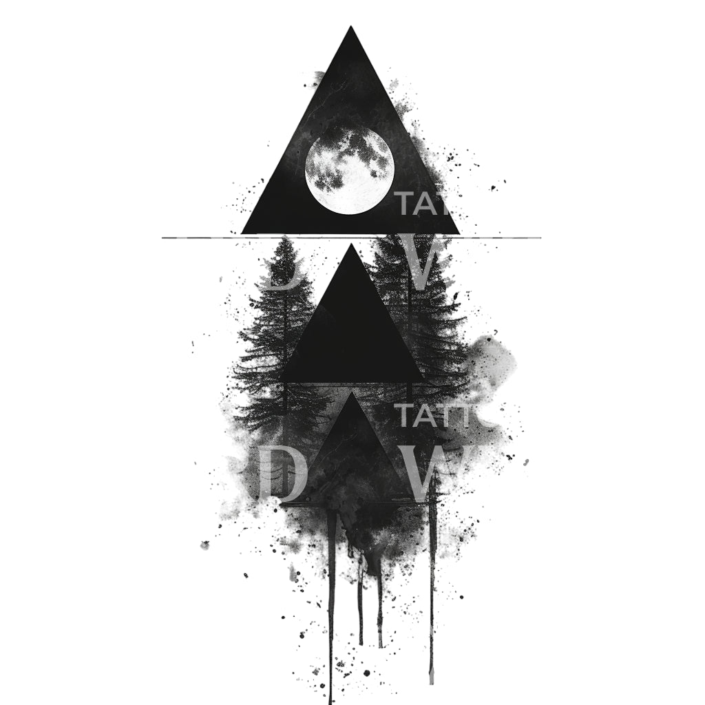 沉浸在自然的深处,欣赏这款黑灰色的纹身设计。采用点刺技法精心制作,设计将三角形的几何戏剧与黑暗森林松树的神秘魅力完美融合。真正体现了优雅,并向未驯服的荒野致敬。