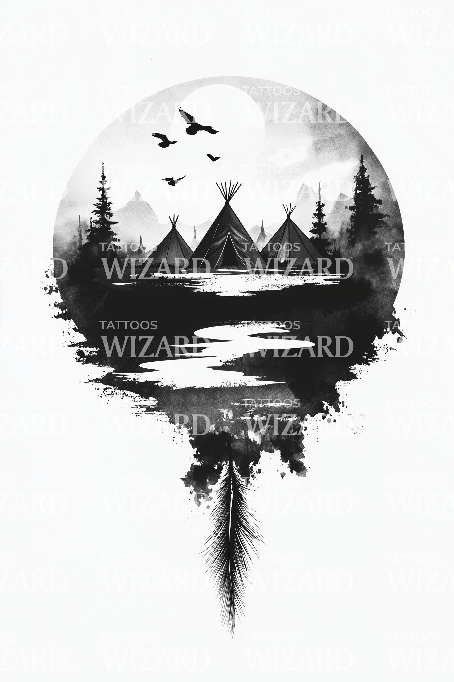Midnight ink washes form a black&grey forest and mountain lake, teepees mirrored beneath a luminous moon, birds drifting above, a feather tapering into calm water. Reflections suggest self-knowledge, the moon guides, birds promise return. This landscape brings grounding stillness, quiet belonging, and a wandering spirit, steady with enduring strength.