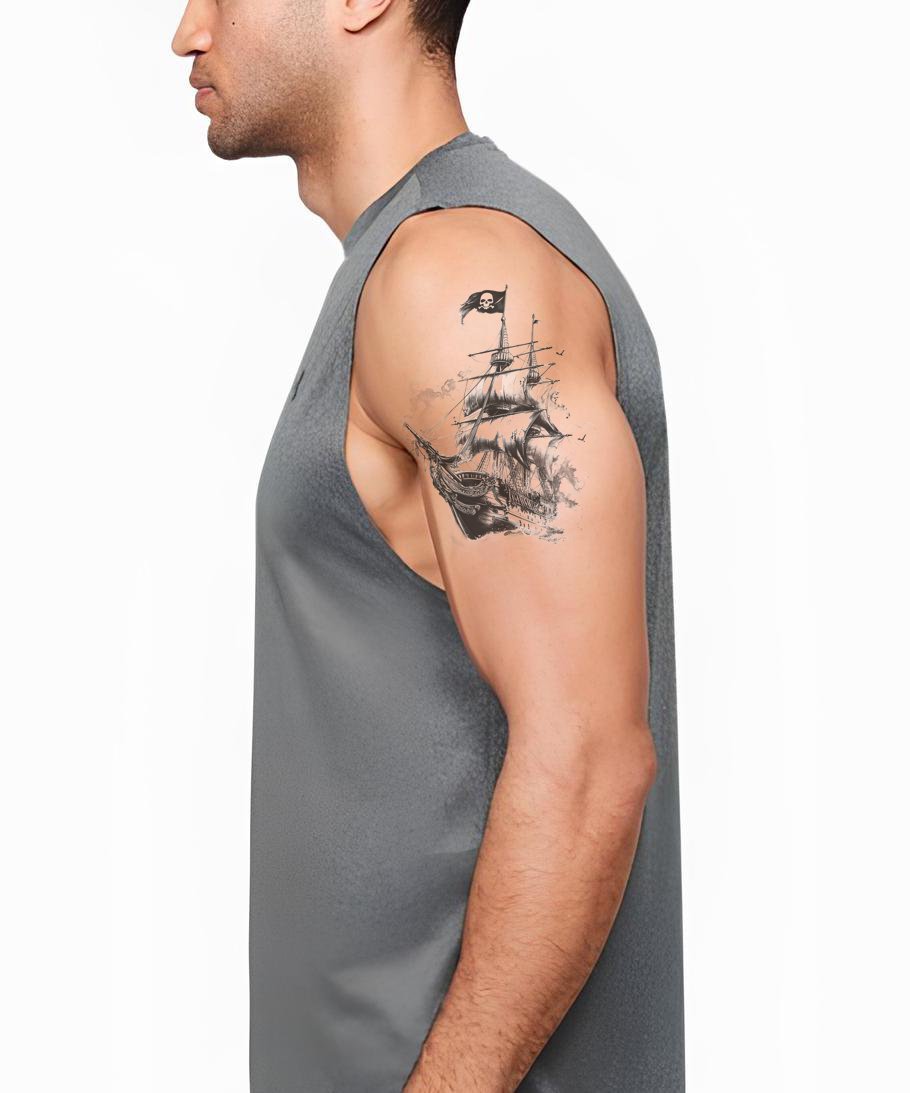 释放你冒险的精神,选择这款黑灰色的纹身设计。它描绘了一位危险的海盗在一艘适合航行的船上挥舞着枪,这件作品向迷人的海洋魅力及其危险故事致敬。非常适合那些珍视生活冒险刺激的人。