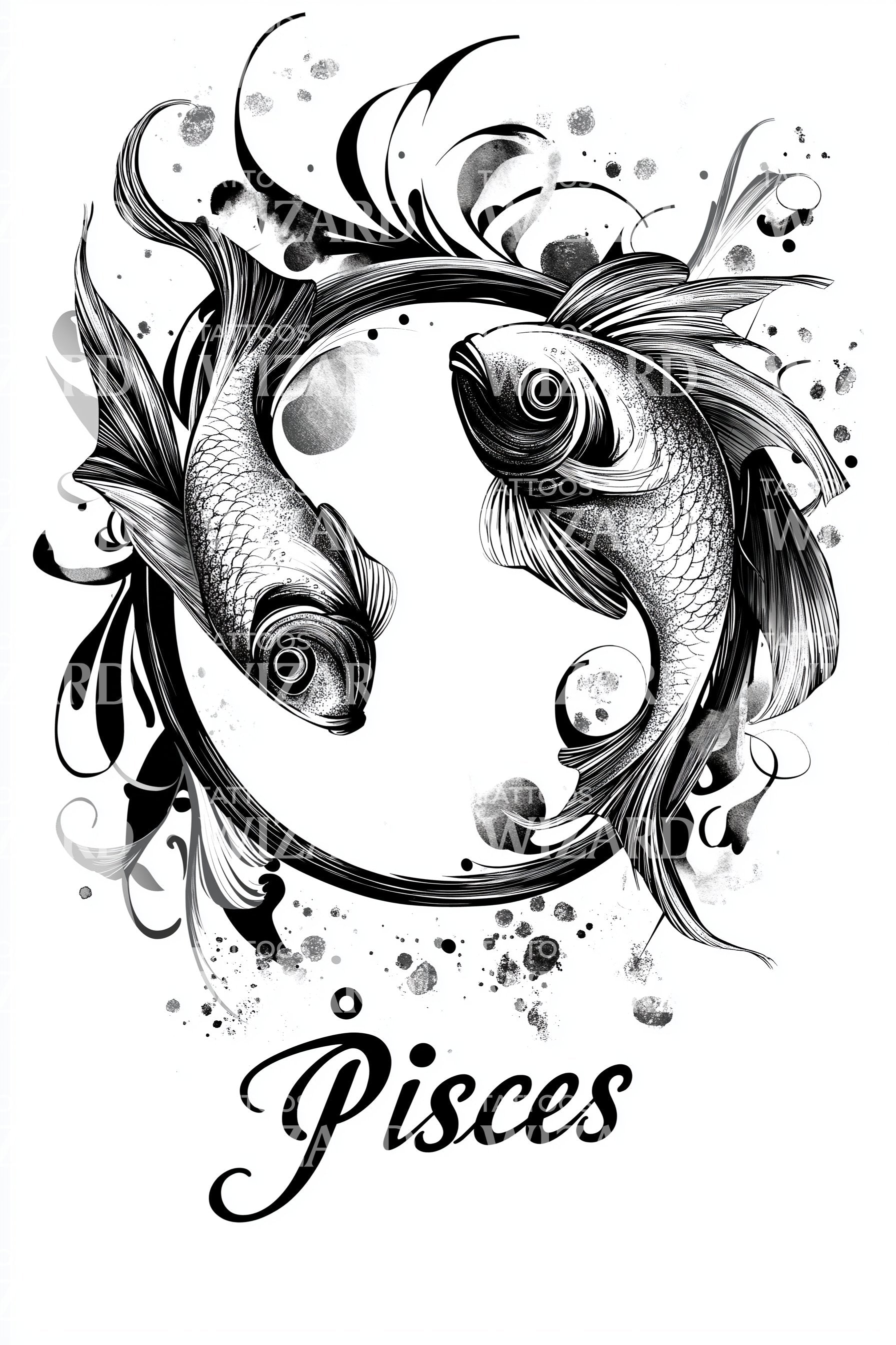 Blackwork Pisces coils in a liquid ring: two graceful fish, fine stipple scales and flowing fins, framed by inky splashes and calligraphic currents. The mirrored pair honors zodiac duality, intuition, and the endless water cycle. Wearing it feels tidal, calm yet electric, guiding heart and spirit toward balance.