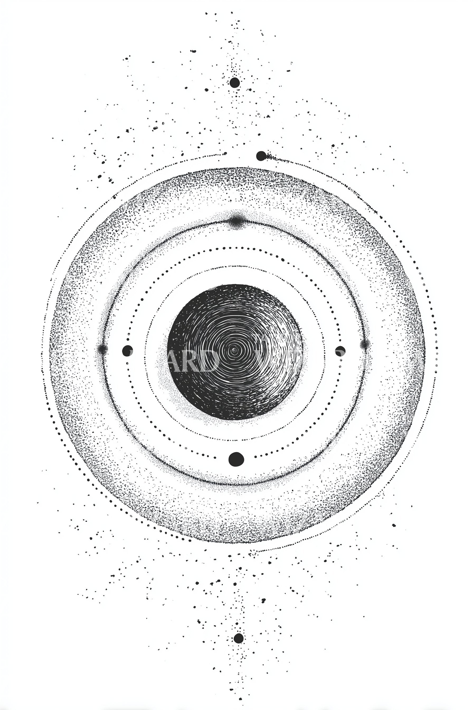 Geometric cosmos etched in stippled concentric rings, a swirling planet at center, dotted orbits and speckled stardust mapping a serene system. Symbolizes balance, cycles, and the gravity of purpose drawing everything gently home. Worn daily, it radiates calm momentum, cosmic alignment, and quiet wonder, guiding intentions in orbit.