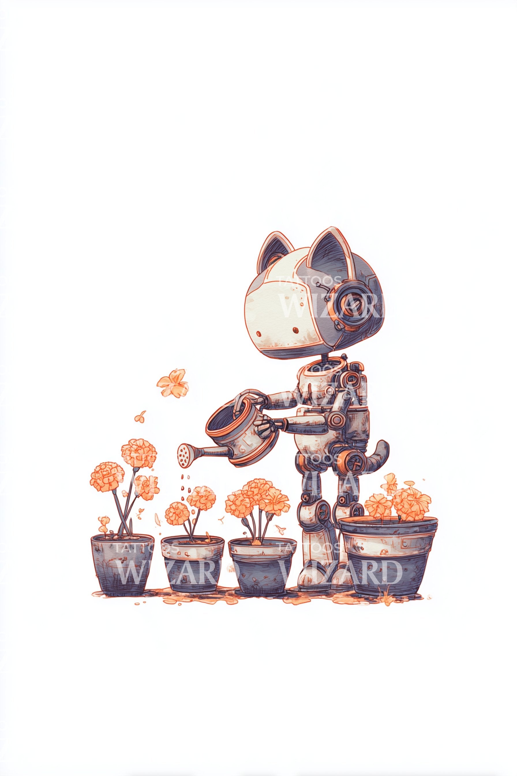 释放你古怪的一面,这款色彩丰富的插画风纹身设计!展现了一个机器人呵护早期嫩芽的奇幻画面,旁边还有一只纹身风格的猫咪伙伴,这件作品是一段充满趣味的成长旅程。非常适合那些被科技与自然奇妙碰撞所吸引的人。