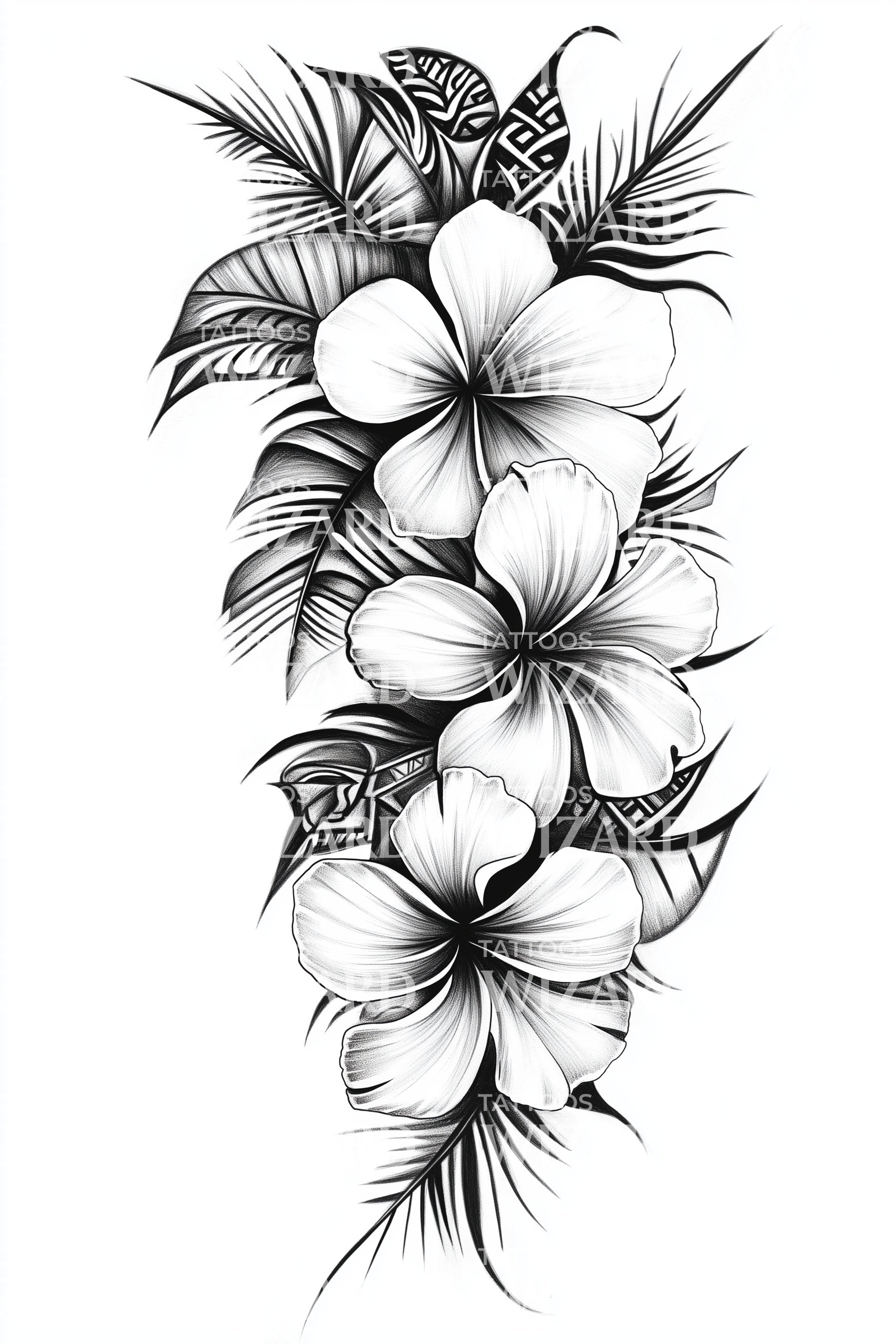 体验波利尼西亚文化的神秘魅力,这款独特的部落纹身设计。以层叠的精致鸡蛋花图案为特色,这款垂直作品在醒目的部落图腾中注入了花卉的韵味。异域与大胆的完美融合,成就了一个引人注目的身体艺术选择。