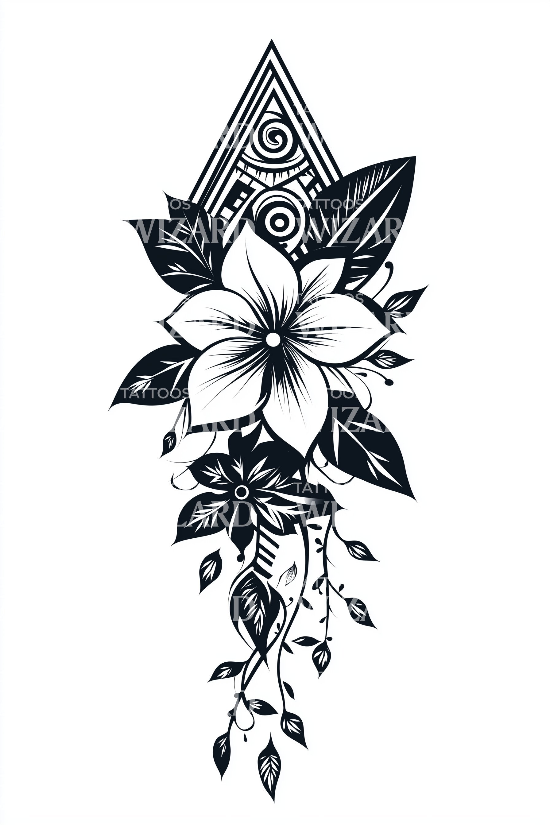 沉浸于这款几何纹身设计的永恒魅力。独特地以吊坠三角形形式打造,精细交织着花卉鸡蛋花图案和装饰性纹样。现代风格与经典美学的完美结合,完美融合了对称与植物的魅力。每位纹身爱好者的必备之选。